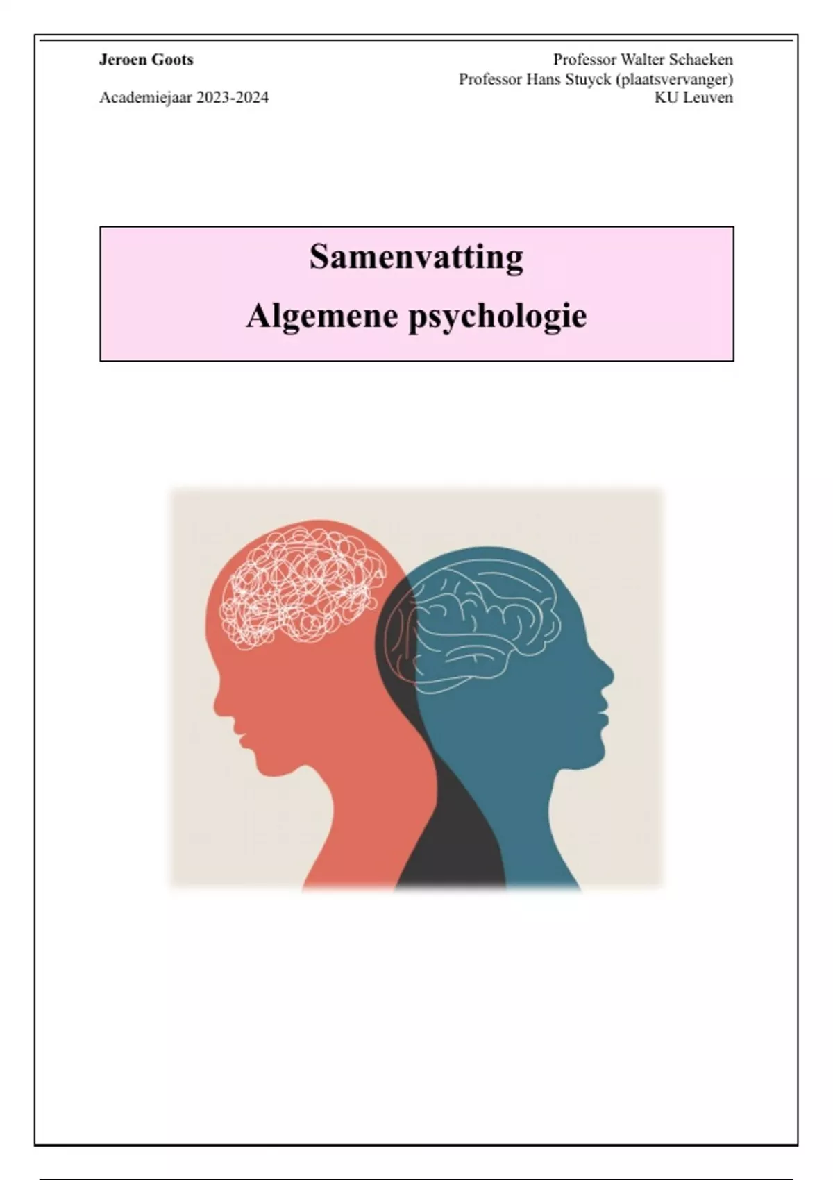 Hoi, leuk dat je hier bent! Op deze pagina vind je al mijn samenvattingen die ik tot nu toe tijdens mijn studie Wijsbegeerte en Psychologie aan de KU Leuven heb gemaakt. Mijn samenvattingen zijn gestructureerd, volledig (altijd incl. handboek) en bevatten tips om het studeren vlotter te laten verlopen, zoals antwoorden op examenvragen. Dankzij deze samenvattingen was mijn gemiddelde na het eerste jaar 82.58% en na het tweede jaar 80.96%. Hopelijk vind je hier wat je zoekt :) Heel veel succes met je studie! Groetjes Jeroen