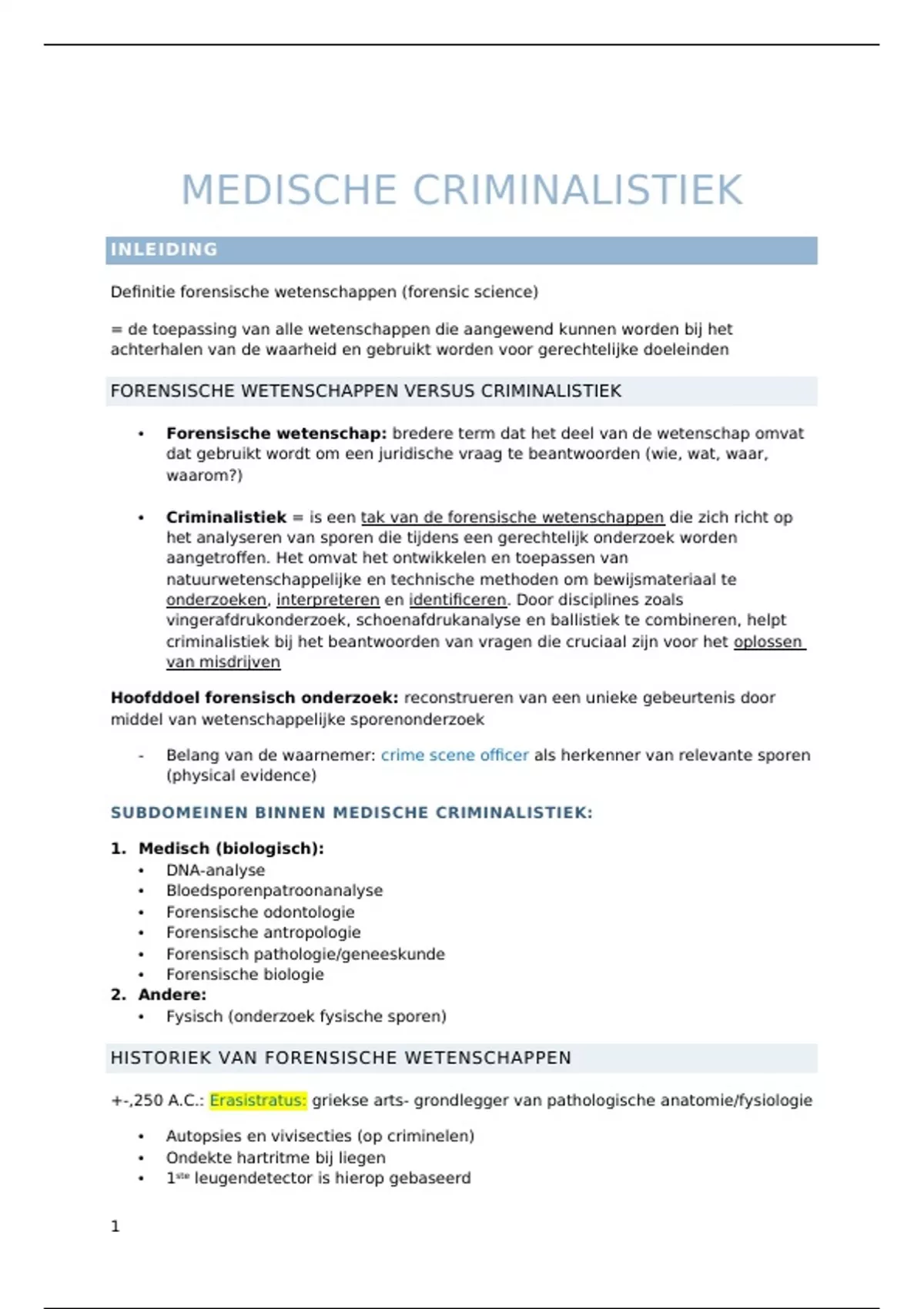 Dit is een samenvatting medische criminalistiek, de gastcolleges en de lessen van Prof. Evy De Boosere staan in 2 aparte delen, dit vond ik overzichtelijker om te leren. Ik behaalde met deze samenvatting 15/20. Veel succes!!