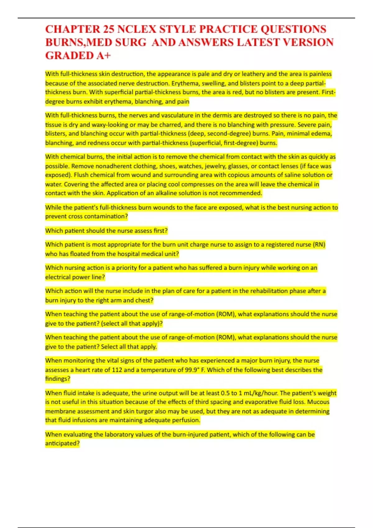 CHAPTER 25 NCLEX STYLE PRACTICE QUESTIONS BURNS,MED SURG AND ANSWERS LATEST VERSIO