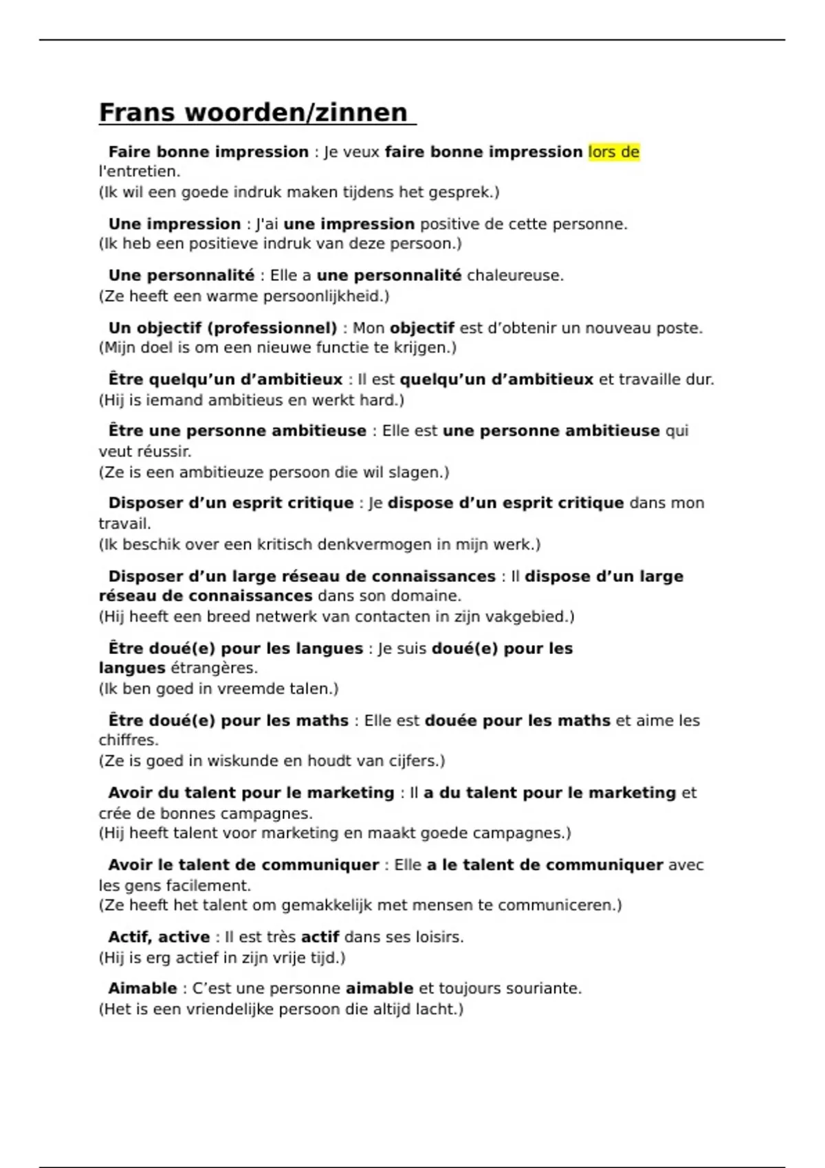 Op het examen wordt er vaak gevraagd om zinnen te maken met de voc. Dit is een lijst met alle vocabulaire en potentiële franse zinnen met de Nederlandse vertaling. Dit heeft mij zeer veel geholpen op het examen, zo moet je ook zelf niet bij ieder woord zelf een zin make !!!
