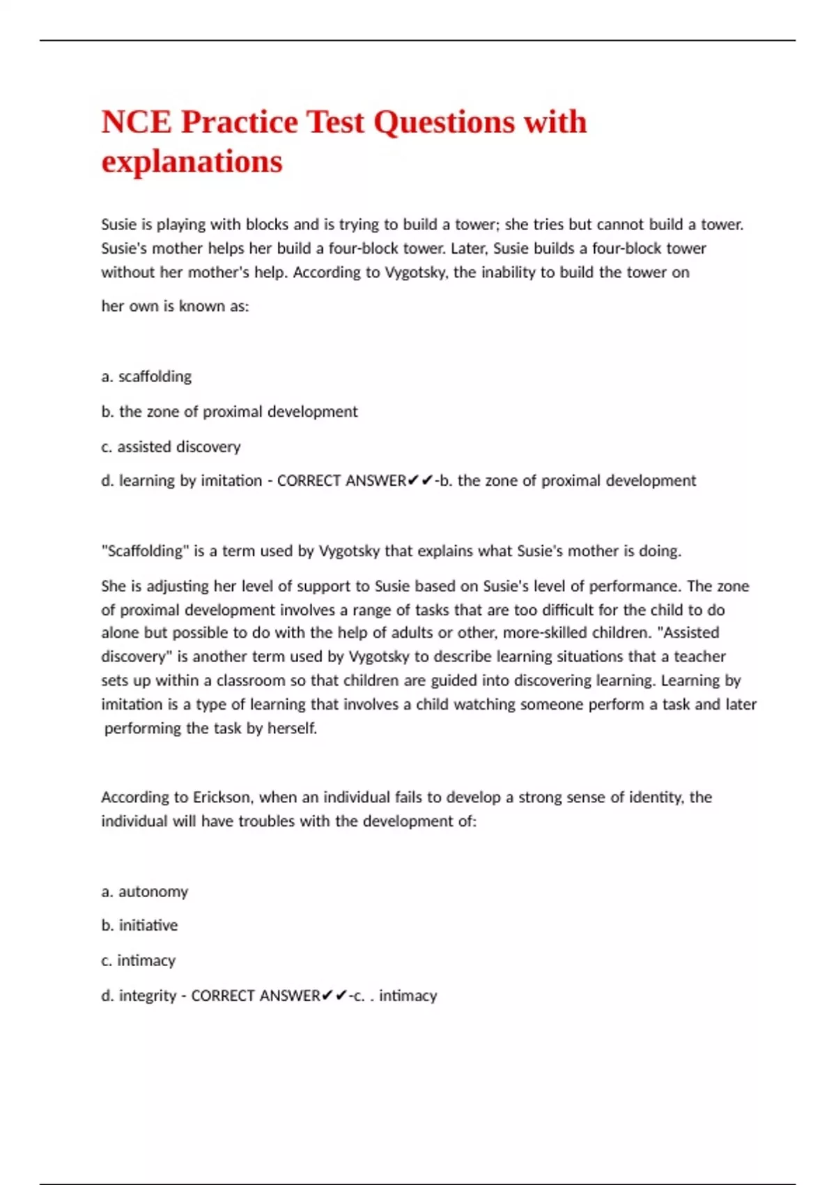 d. |integrity |- |CORRECT |ANSWER✔✔-c. |. |intimacy