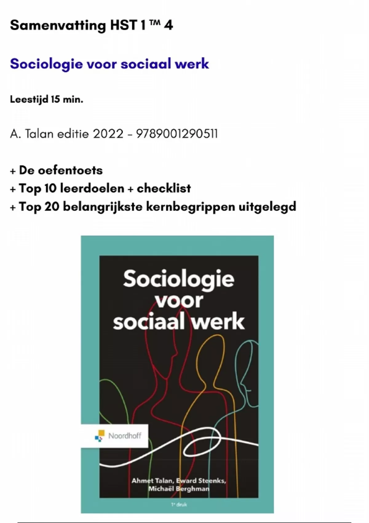 Tentamen samenvatting HST 1 tm 4 Sociologie voor sociaal werk A. Talan - editie 2021 / 9789001290511 / + oefentoets + de leerdoelen + kernbegrippen