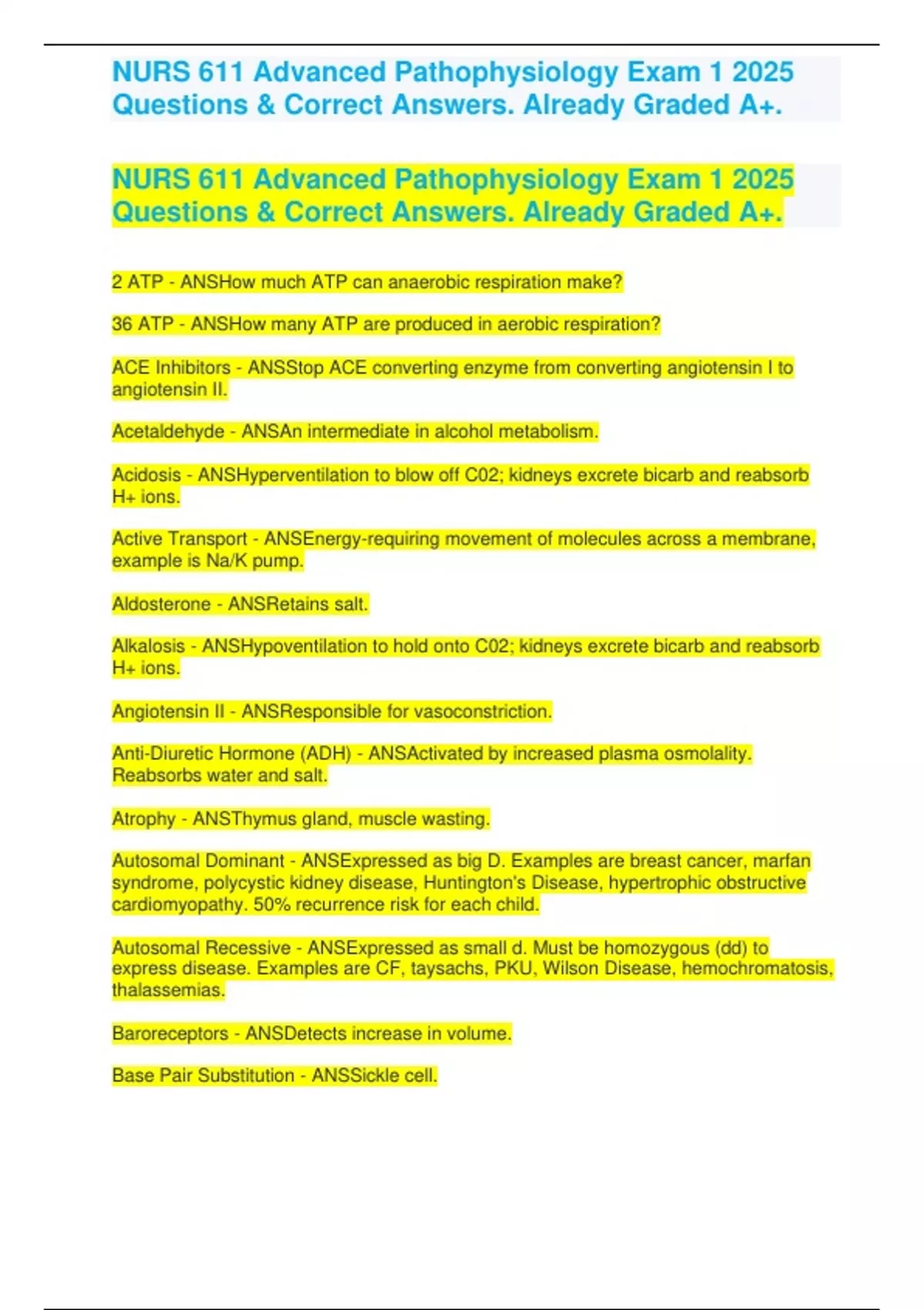 NURS 611 Advanced Pathophysiology Exam 1 2025