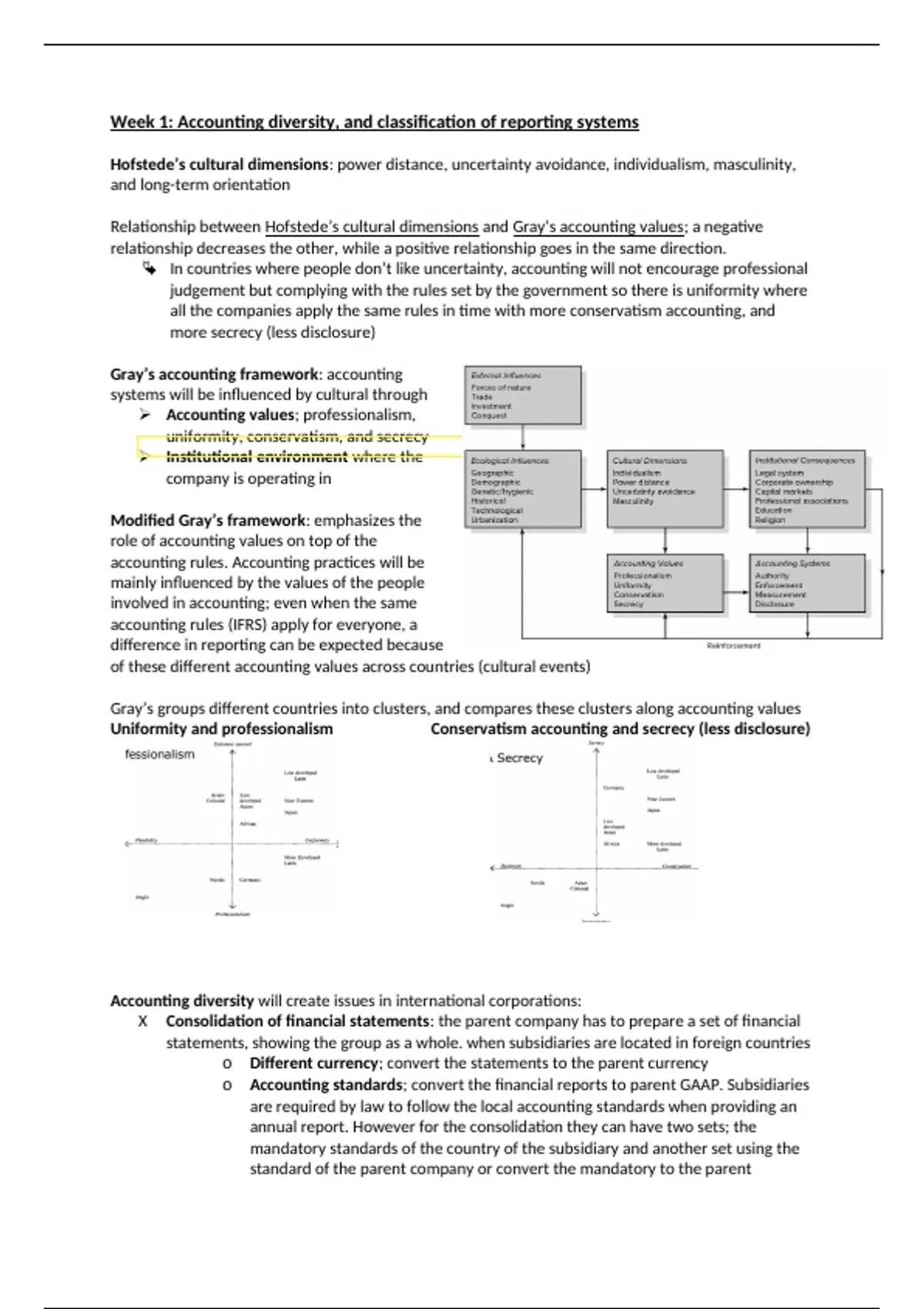 This document explores the interplay between cultural dimensions and accounting practices, highlighting how cultural factors influence reporting systems. It discusses the implications of accounting diversity for multinational corporations, including consolidation challenges, financial statement comparability, and the impact of international accounting standards like IFRS and US GAAP. Most important concepts, including examples; - Cultural Dimensions: Factors like power distance and individualism that influence accounting practices across countries. - Accounting Diversity: Variations in accounting standards and practices that create challenges for multinational corporations. - Consolidation Challenges: Issues faced by parent companies when consolidating financial statements from subsidiaries in different countries. - IFRS vs. US GAAP: Comparison of international financial reporting standards and their impact on financial statement preparation. - Financial Statement Comparability: The importance of understanding different accounting rules for effective financial analysis. - International Taxation: The role of tax laws in shaping multinational corporations' financial strategies and reporting. - Reporting systems - International convergence of financial reporting - Corporate governance and analysis of financial statements - Foreign currency transactions, translation, and hedge risk - International taxation and transfer pricing