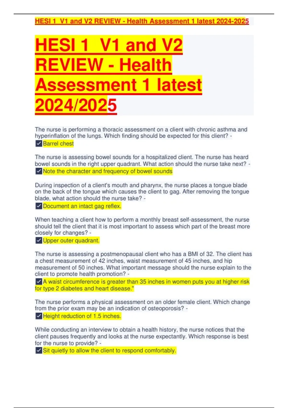 , HESI 1 V1 and V2 REVIEW - Health Assessment 1 latest 2024-2025