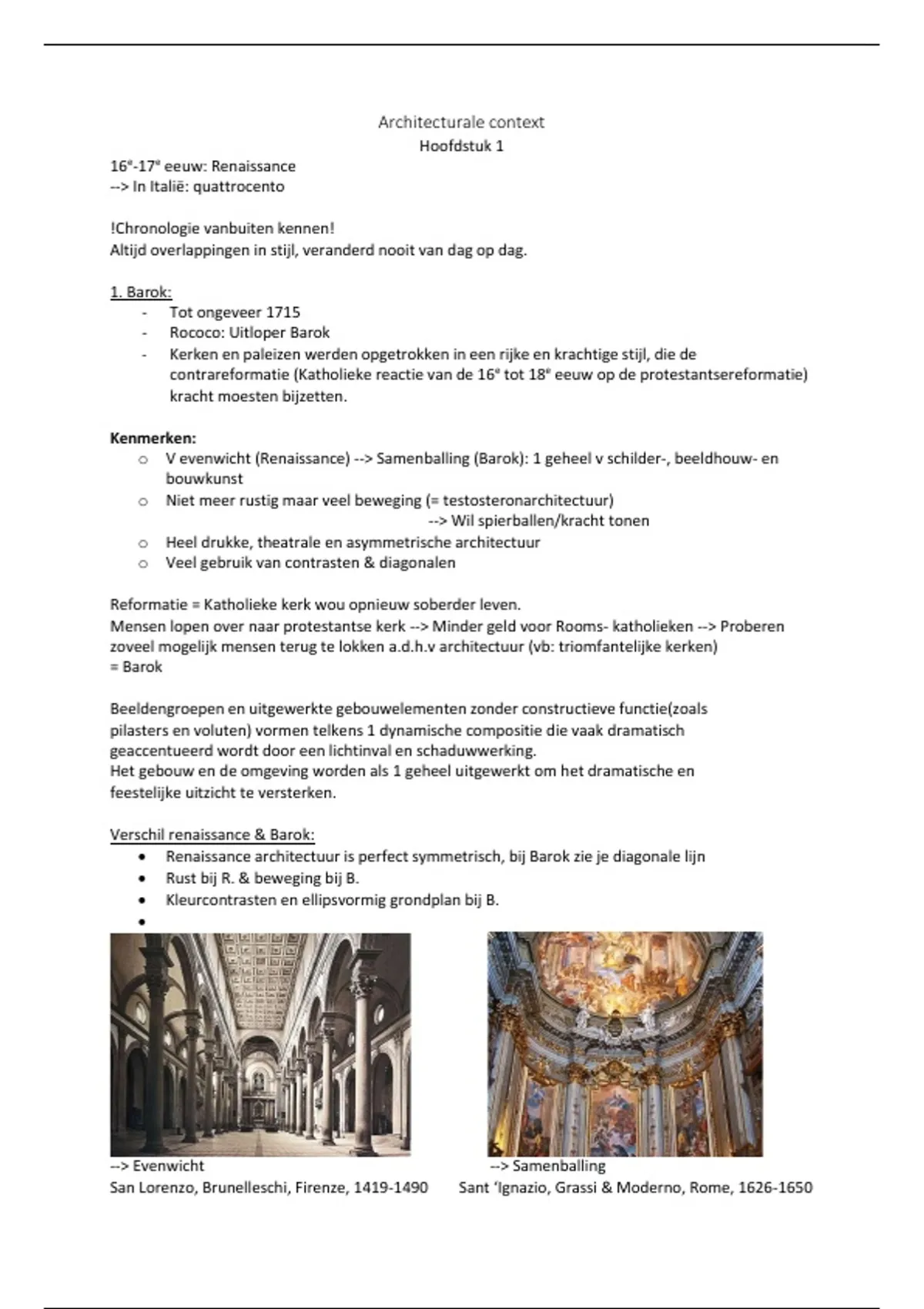 • Renaissance architectuur is perfect symmetrisch, bij Barok zie je diagonale lijn