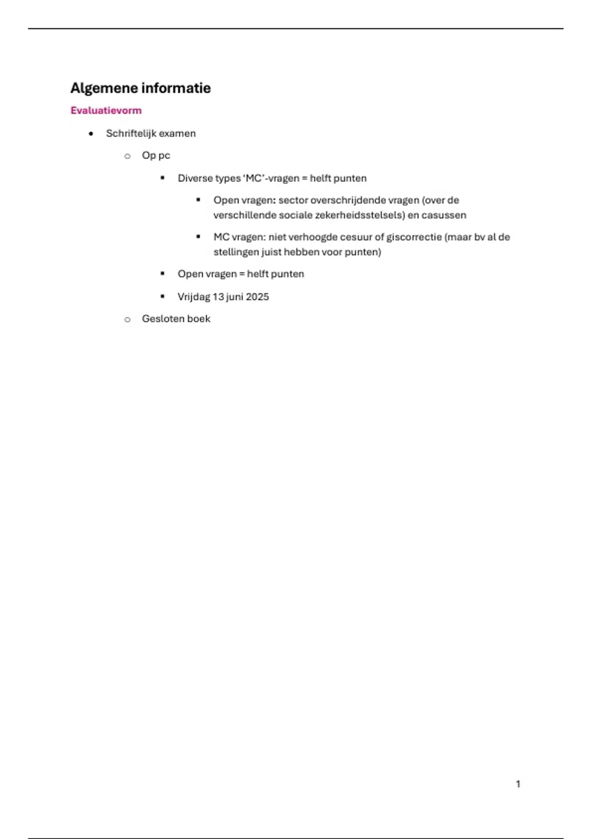Dit is een zeer volledige samenvatting van het vak sociale zekerheidsrecht gegeven door Kim Van den Langenbergh. De samenvatting omvat alle slites, alle uitleg gegeven door de professor in de hoorcolleges en extra uitleg uit het boek 'Synopsis van het Belgische sociaal recht - Socialezekerheidsrecht'. Ik behaalde hiermee 18/20.