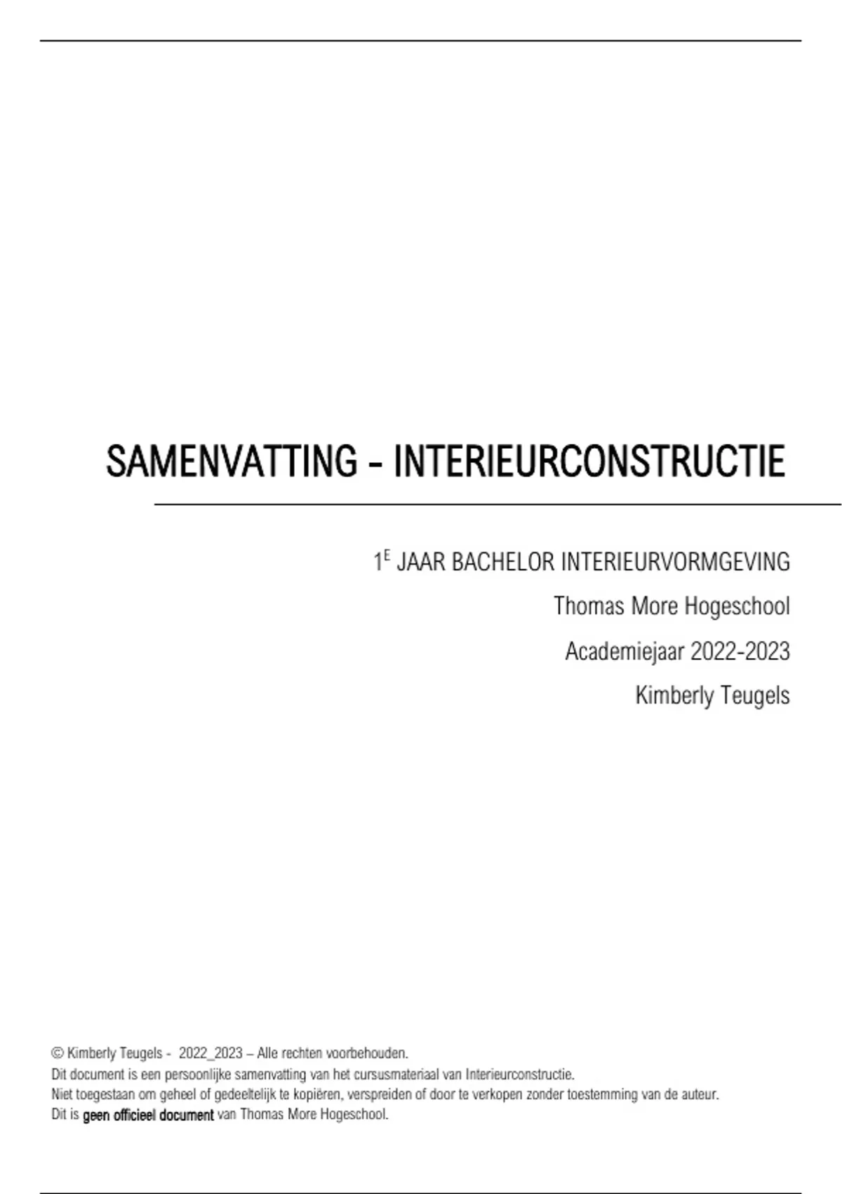Dit document is een persoonlijke samenvatting van het cursusmateriaal van Interieurconstructie.