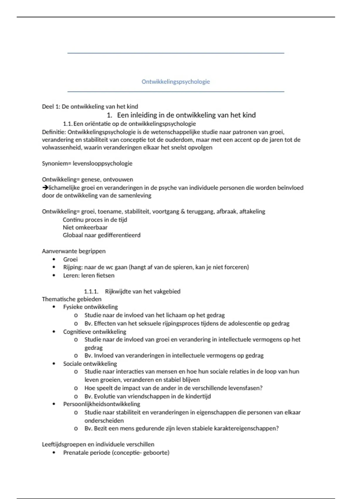 Samenvatting van 54 pagina's voor het vak ontwikkelingspsychologie aan de tmhs (geslaagd)