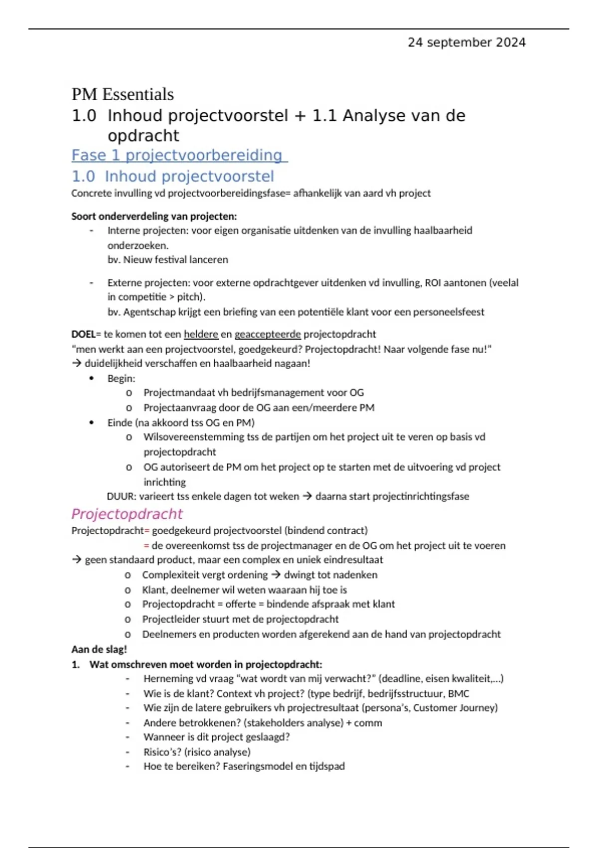 o Projectopdracht = offerte = bindende afspraak met klant
