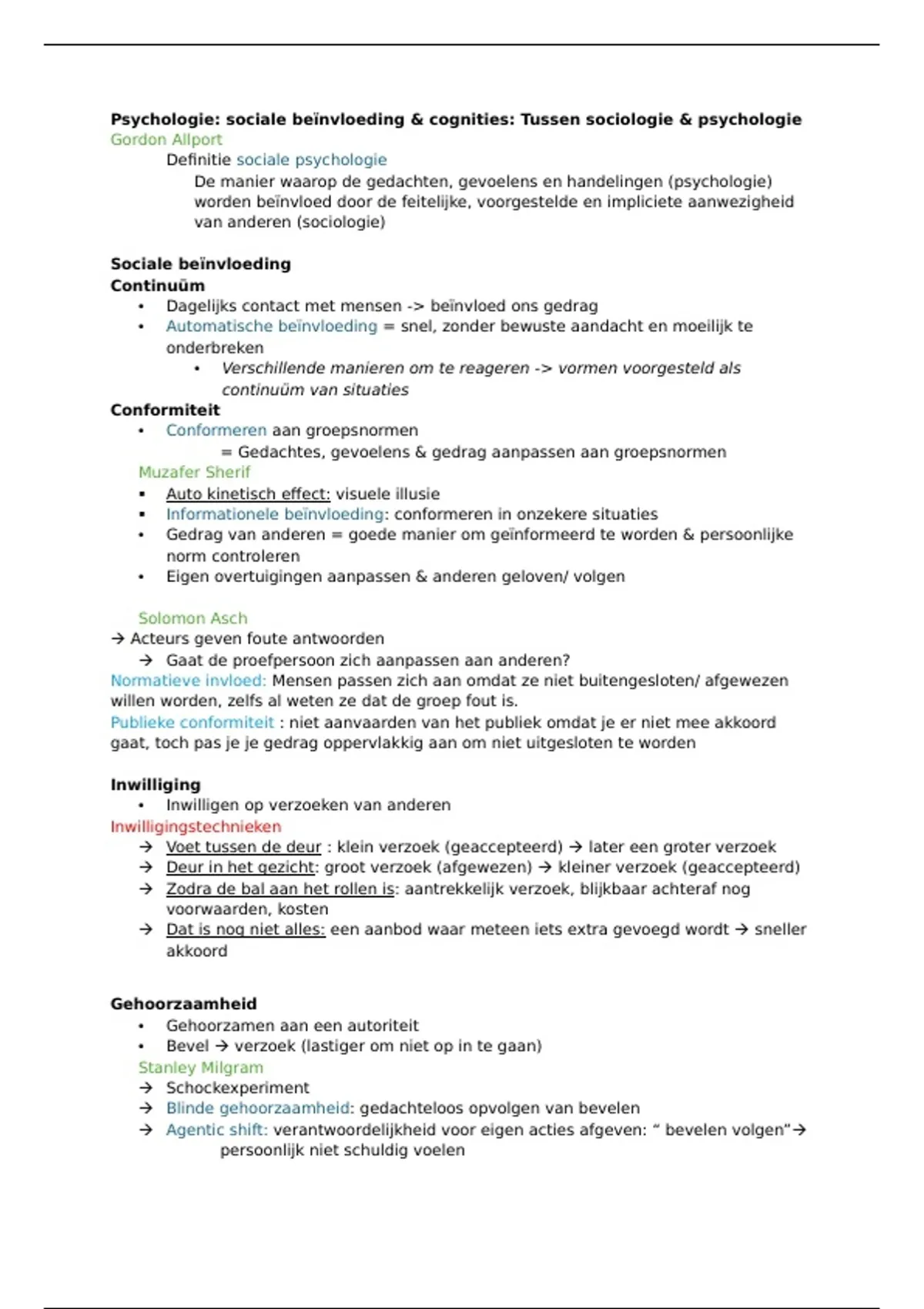 Deze uitgebreide samenvatting bundelt alle belangrijke theorieën, begrippen, experimenten en modellen binnen sociale beïnvloeding, attitudes, sociale cognities en gedragsverklaring. De leerstof wordt helder uitgelegd met voorbeelden, waardoor dit document ideaal is voor toetsen, examens, opdrachten of snelle herhaling.