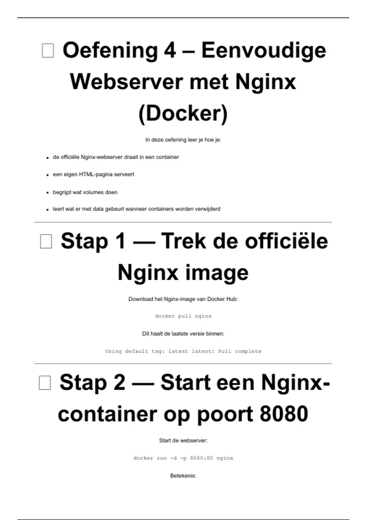 -p 8080:80 → map hostport 8080 naar containerpoort 80