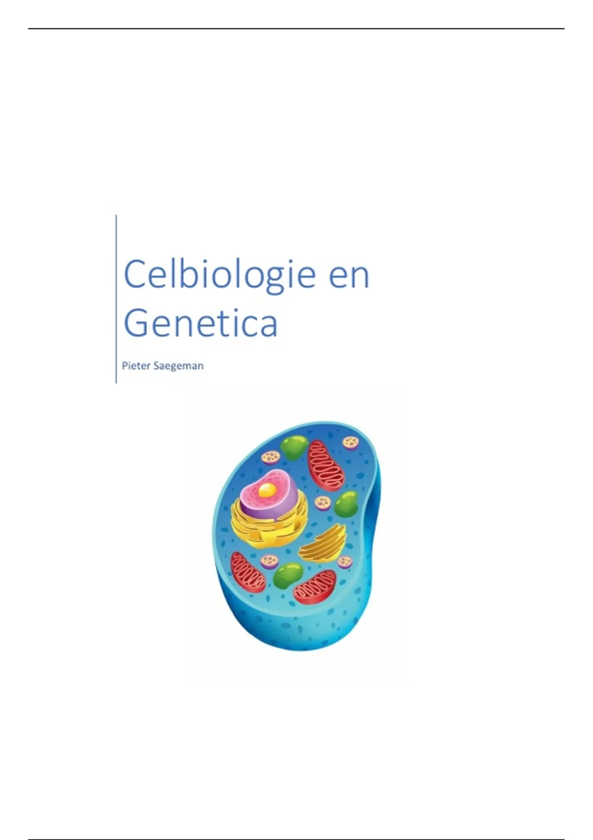 Dit is mijn samenvatting van celbiologie en genetica van de eerste bachelor biologie. Deze samenvatting omvat alles van de verschillende celorganellen bij celbiologie tot de wetten van mendel bij de genetica en nog veel meer. Deze samenvatting is gebaseerd op de cursus van de UGent door Prof. dr. Geert De Jaeger, maar is zeker ook bruikbaar voor andere lessen over dezelfde onderwerpen.