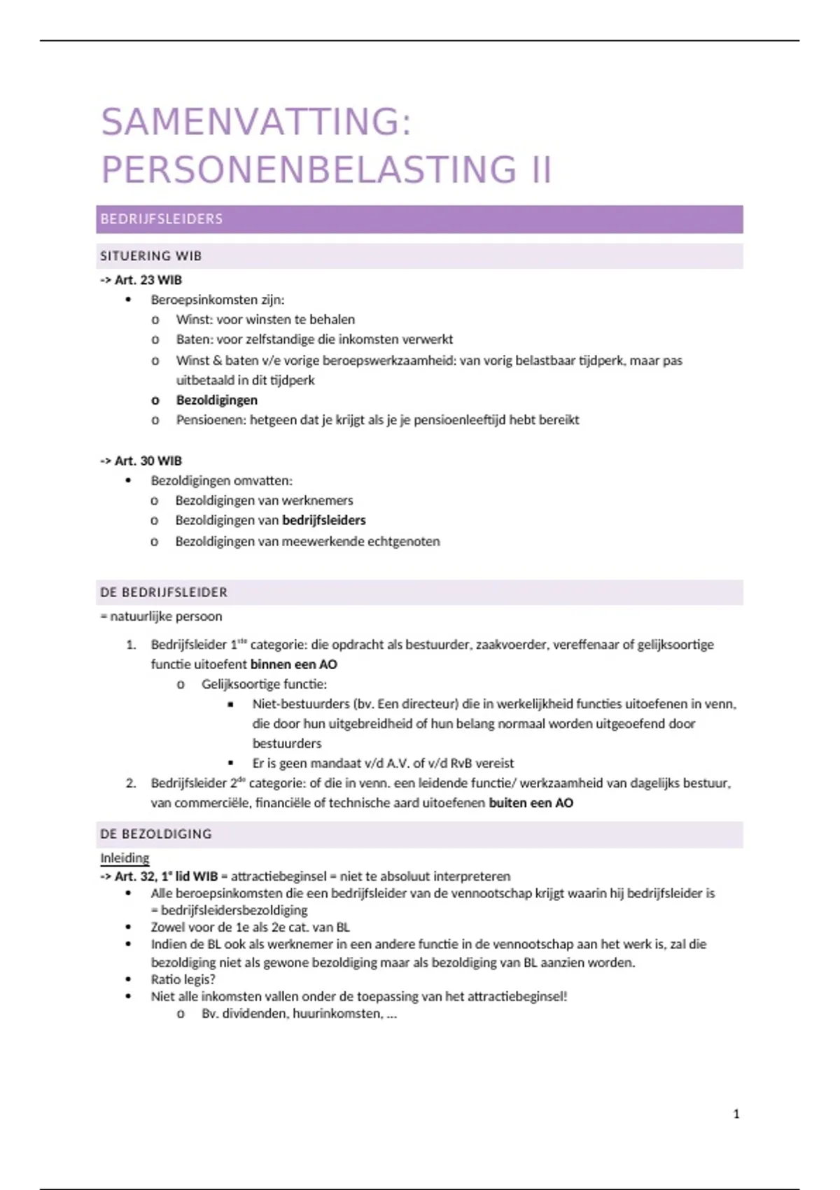 Beschrijving: Deze samenvatting behandelt alle belangrijke onderwerpen uit Praktische Personenbelasting II. Ideaal voor studenten die een duidelijk overzicht willen van de complexe regels rond de personenbelasting en deze efficiënt willen toepassen. Wat je vindt in deze samenvatting: - Uitleg van kernconcepten van de personenbelasting, inclusief inkomsten uit arbeid, onroerende goederen, en diverse aftrekposten - Praktische voorbeelden die de toepassing van de regels duidelijk maken - Overzichtelijke schema’s en tabellen voor snel inzicht - Tips om tentamens en opdrachten efficiënt voor te bereiden Waarom deze samenvatting handig is: - Bespaart studietijd en biedt structuur bij complexe onderwerpen - Ideaal voor tentamenvoorbereiding - Compleet overzicht van de kernpunten uit het vak
