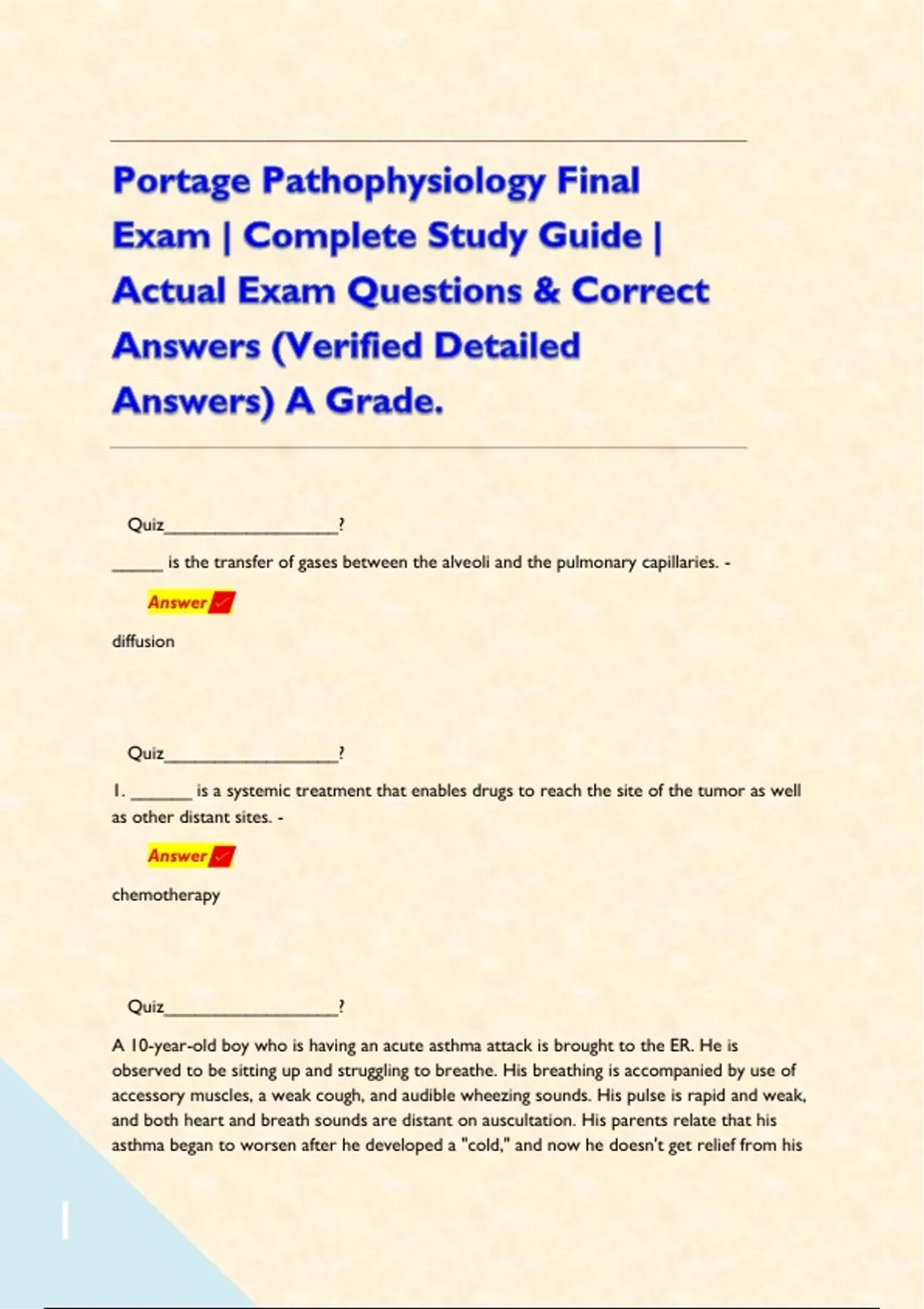 Portage Pathophysiology Final Exam | Complete Study Guide | Actual Exam Questions & Correct Answers (Verified Detailed Answers) A Grade. Quiz_________________? _____ is the transfer of gases between the alveoli and the pulmonary capillaries. - Answer diffusion Quiz_________________? 1. ______ is a systemic treatment that enables drugs to reach the site of the tumor as well as other distant sites. - Answer chemotherapy Quiz_________________? A 10-year-old boy who is having an acute asthma attack is brought to the ER. He is observed to be sitting up and struggling to breathe. His breathing is accompanied by use of accessory muscles, a weak cough, and audible wheezing sounds. His pulse is rapid and weak, and both heart and breath sounds are distant on auscultation. His parents relate that his asthma began to worsen after he developed a "cold," and now he doesn't get relief from his albuterol inhaler. Explain the changes in physiologic function underlying his signs and symptoms. - Answer -inflammatory cells secrete chemicals toxic to organisms causing airway inflammation -Swelling of bronchial wall, mucus secretion, bronchial hyper-responsiveness to stimuli causes airway narrowing. Quiz_________________? A 23-year-old African-American man with a history of severe lifelong anemia requiring many transfusions has nonhealing leg ulcers and recurrent periods of abdominal and chest pain. These signs and symptoms are most likely to be associated with which one of the following laboratory abnormalities? - Answer Sickle cells on peripheral blood smear Quiz_________________? A 45-year-old woman presents with fatigue, weight gain, and cold intolerance. Lab findings show a low serum T4 and elevated TSH. 1. What diagnosis would her history and lab findings indicate? 2. What type of treatment should be given? - Answer -Hypothyroidism- synthetic T4 thyroid hormone, thyroxine Quiz_________________? A 72-year-old male is said to be in phase 3 of gout. He is obese and has a history of alcohol abuse. Develop a treatment plan including specific pharmacologic intervention and a non-pharmacologic recommendation to manage his disease. - Answer - Goal is to maintain normal uric acid levels and prevent progression - recommendations are allopurinol and avoiding purine rich foods Quiz_________________? A 75-year-old male is brought to the emergency department via ambulance at 5 pm. The patient's spouse reports that when they woke up (approximately at 6 am) he reported to her that he was having some blurred vision but decided to go about his day. As the day progressed, he started experiencing tingling and feelings of weakness on the entire left side of his body. He has a past medical history of diabetes. Based upon these symptoms and past medical history, what do you suspect this patient is experiencing? How would you confirm this diagnosis? What treatment should be administered? Explain why you chose that treatment - Answer ischemic stroke- CT scan and MRI needed to determine if clot blocking blood flow to brain tissue and rule out hemorrhagic stroke If clot is found, patient needs to be reperfused through catheter-base methods as they are outside of 3-4.5 treatment window for tPA drug Quiz_________________? A 9-year-old boy with a peanut allergy was exposed to peanuts. He presents to the emergency room with an anaphylactic reaction. (1) What symptoms might he present with? (2) Does the quantity of exposure mean he will have a more severe reaction? (3) What is the initial immediate treatment? (4) What are 2 things people with anaphylaxis should always carry? Your Answer: - Answer hypotension/tachycardia, no, epinephrine allergy identification and epipen Quiz_________________? A patient is said to be in stage 2 kidney disease. What would you expect their GFR to be? - Answer C. 70 mL/min/1.73m2 Quiz_________________? A patient presents in the emergency department with severe dehydration secondary to vomiting. The following are the results of their blood work: pH = 8.2, PCO2 = 39 mm, and HCO3 - = 33 mEq/L. Based upon these results, what type of acid-base disorder are they experiencing? Is compensation occurring? Describe a treatment intervention for this disorder. Normal values are as follows: pH = 7.35-7.45, PCO2 = 35-45 mm, HCO3 - = 22-26 mEq/L. - Answer - metabolic alkalosis without compensation as PCO2 is normal - fluids should be replaced with normal saline Quiz_________________? An endocrine hormone is released into circulation to act on a target organ. - Answer True