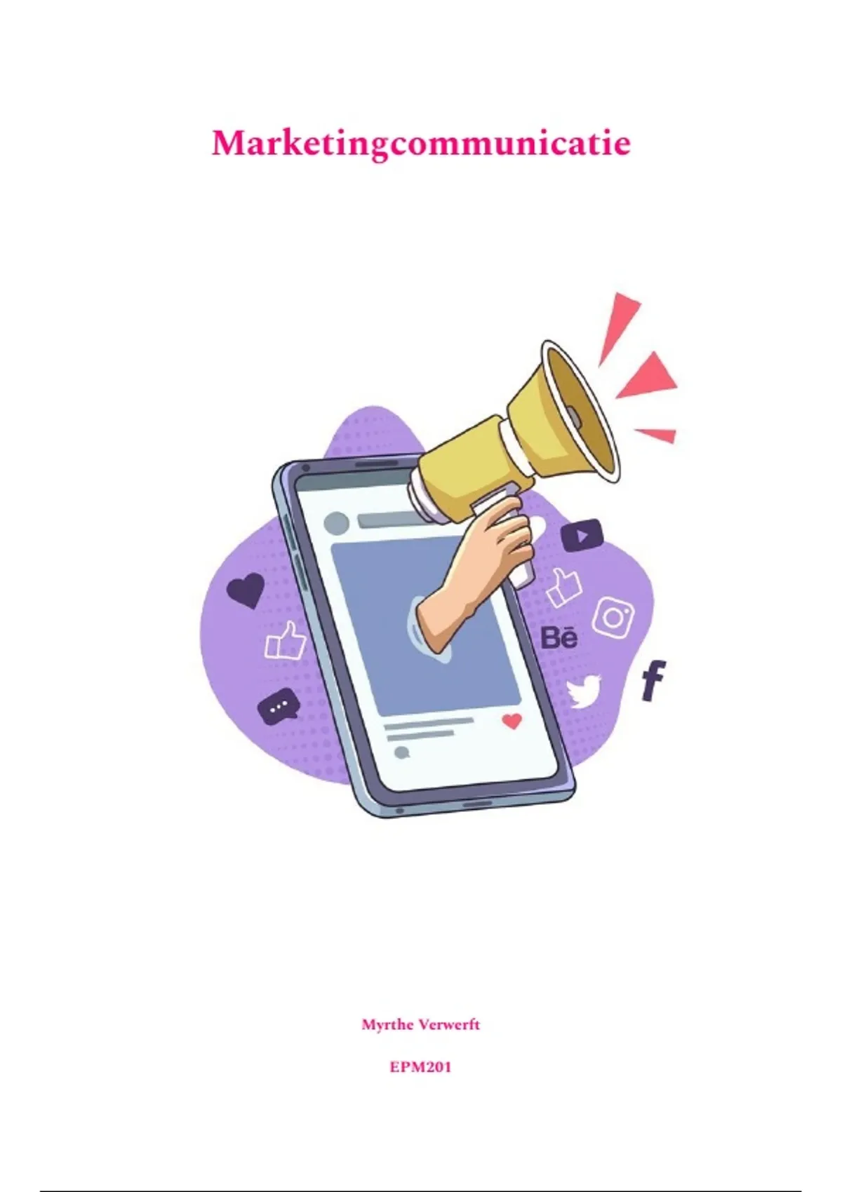 Deze samenvatting behandelt het volledige vak marketingcommunicatie (EPM201) en is gebaseerd op de cursus en lessen. Het document geeft een duidelijk en gestructureerd overzicht van alle belangrijke theorieën, modellen en begrippen die nodig zijn voor het examen. Mijn notities van de gastles staan er ook in + voorbeeldvragen met antwoorden van het examen. Onder andere aan bod komen: geïntegreerde marketingcommunicatie (IMC), merkenbeleid, marketingomgeving, consumentengedrag, marketingcommunicatieplanning, reclame, mediaplanning, merkactivatie, direct marketing, public relations, sponsoring, effectiviteitsmeting en marketingcommunicatie & ethiek. De theorie wordt helder uitgelegd met definities, stappenplannen en concrete voorbeelden uit de cursus. Ideaal als studiemateriaal om snel te herhalen, verbanden te begrijpen en je grondig voor te bereiden op het examen marketingcommunicatie.