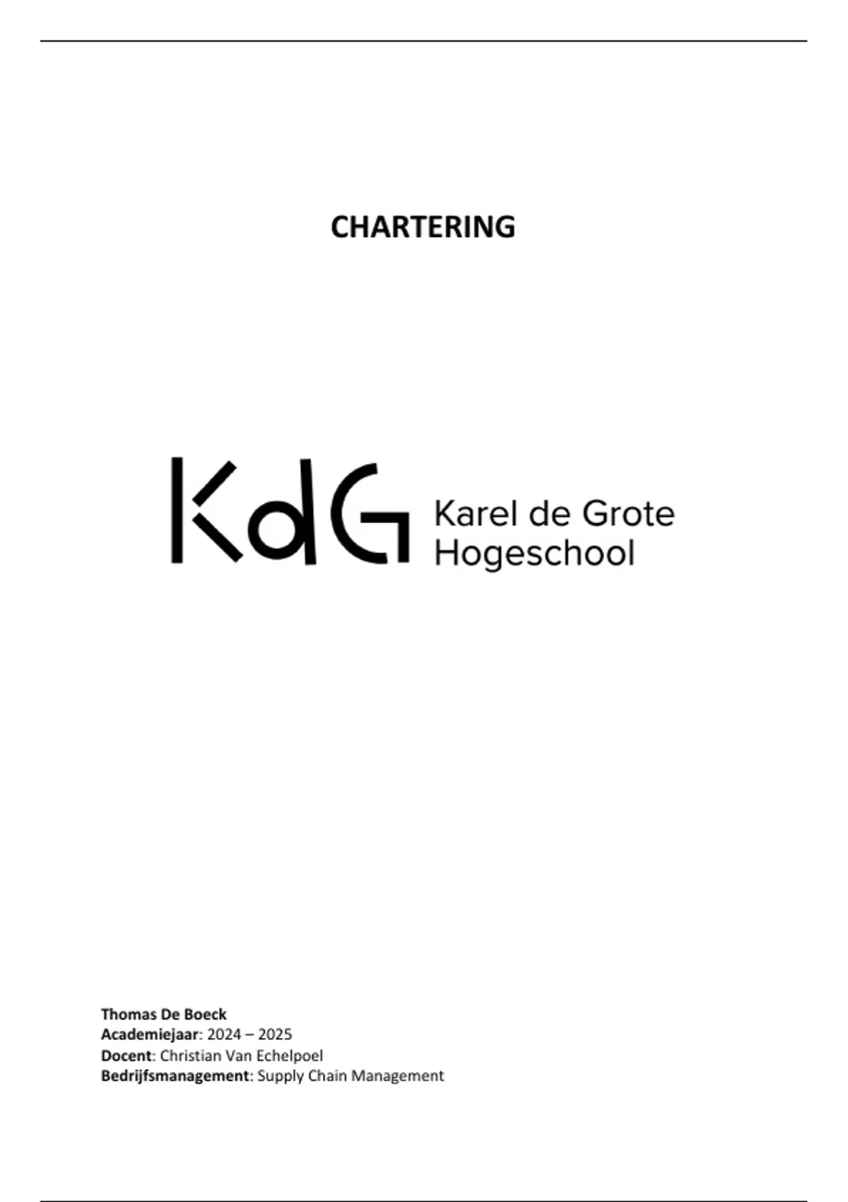 Dit is een samenvatting van het keuzevak Chartering uit het 2e jaar SCM. Dit vak werd gegeven door C. Van Echelpoel. Voor dit vak haalde ik een 17/20. Deze samenvatting bevat enkel theorie, geen oefeningen.
