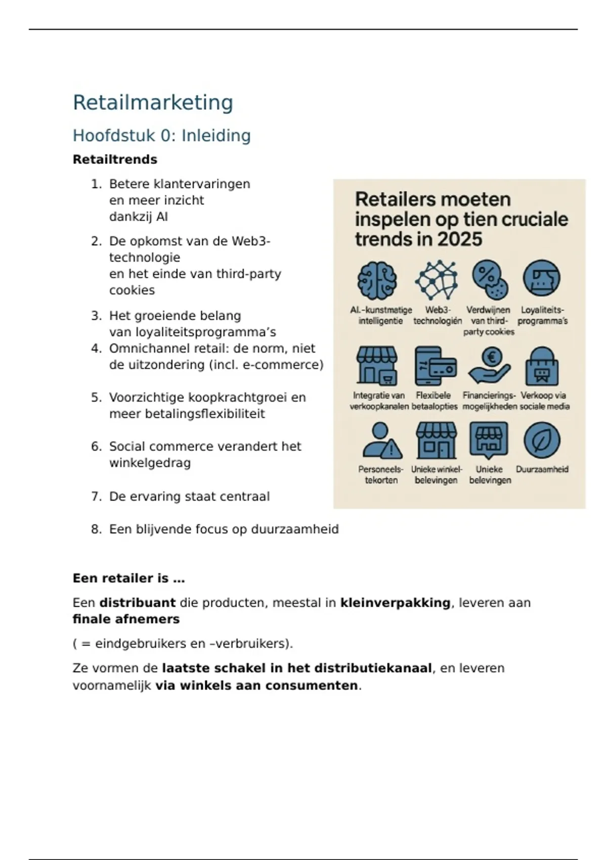 Duidelijke samenvatting met voorbeelden over de leerstof van het gehele semester retailmarketing. Leerstof en extra's neergeschreven en duidelijk verwoord met tabellen en schema's.