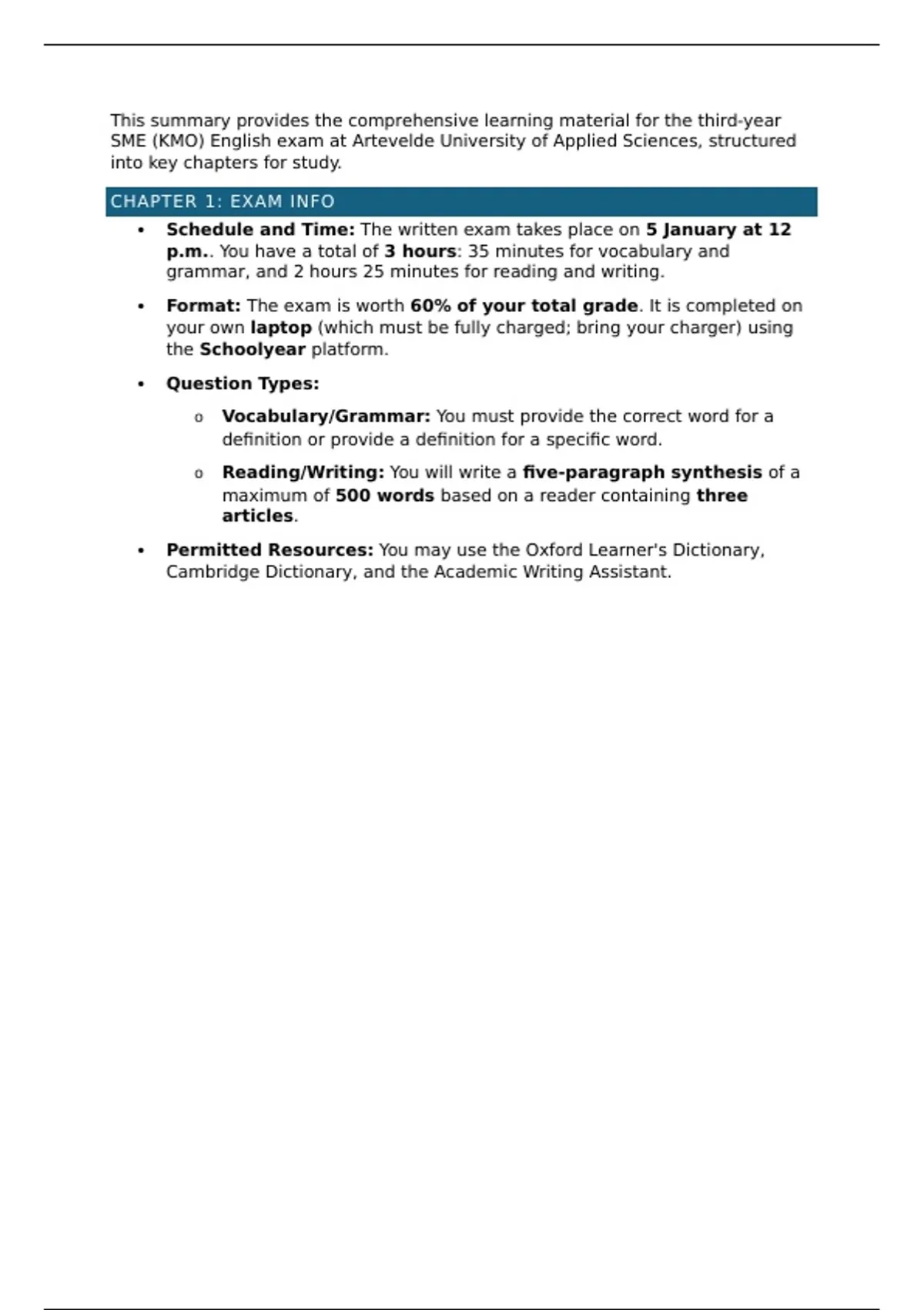 SME (KMO) English exam at Artevelde University of Applied Sciences, structured