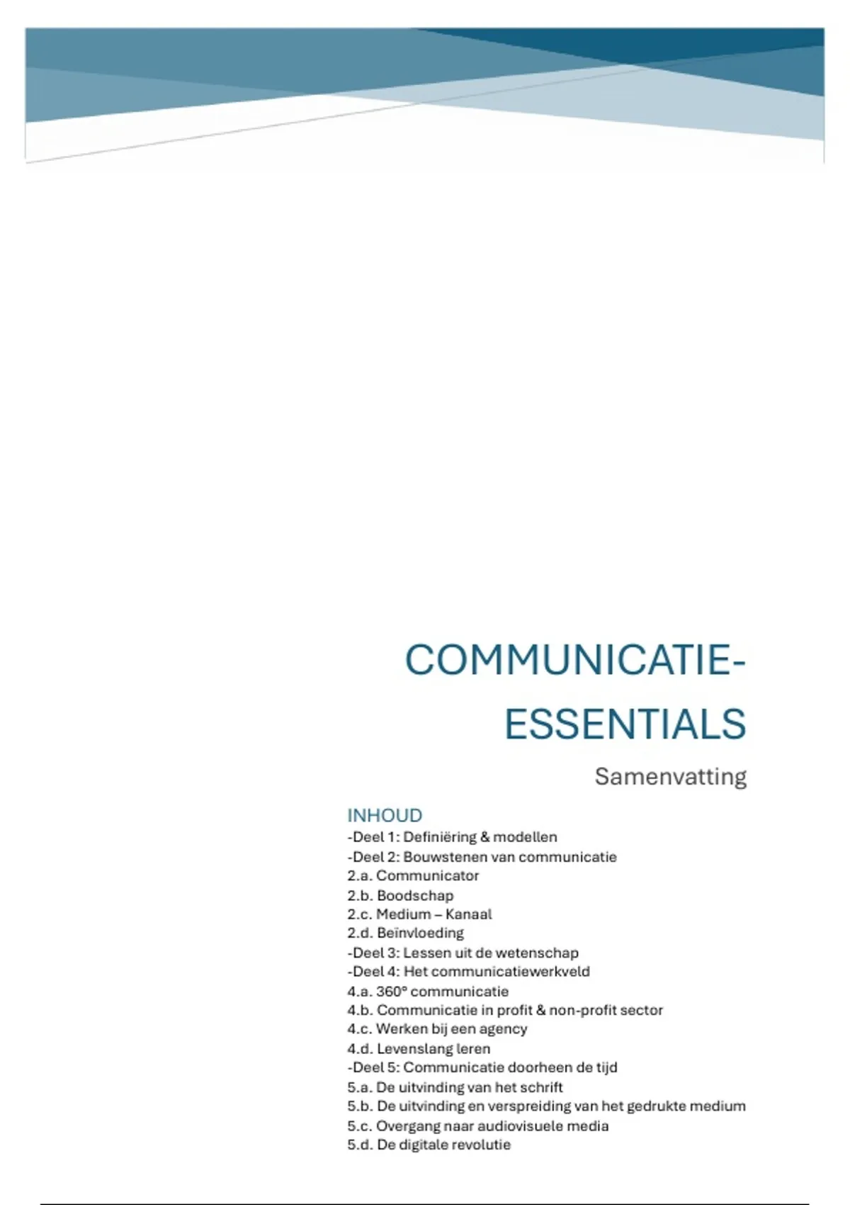 Dit is een uitgebreide samenvatting die duidelijk uitlegt geeft over verschillende communicatiemodellen en de verschillen in communicatie. Daarnaast staan er voldoende voorbeelden in die de theorie visueliseren. Het bevat meerdere uitgebreide delen: -Deel 1: Definiëring & modellen -Deel 2: Bouwstenen van communicatie 2.a. Communicator 2.b. Boodschap 2.c. Medium – Kanaal 2.d. Beïnvloeding -Deel 3: Lessen uit de wetenschap -Deel 4: Het communicatiewerkveld 4.a. 360° communicatie 4.b. Communicatie in profit & non-profit sector 4.c. Werken bij een agency 4.d. Levenslang leren -Deel 5: Communicatie doorheen de tijd 5.a. De uitvinding van het schrift 5.b. De uitvinding en verspreiding van het gedrukte medium 5.c. Overgang naar audiovisuele media 5.d. De digitale revolutie
