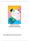 - Uitgebreide samenvatting van Marketing de essentie (15e druk) van Philip Kotler. Deze samenvatting is heel gedetailleerd en de stof wordt toegelicht door duidelijke illustraties. Doordat de samenvatting zo volledig is, heb je het boek zelf niet meer nodig. Ik heb met alleen het leren van deze samenvatting een 8.8 voor mijn tentamen gehaald.