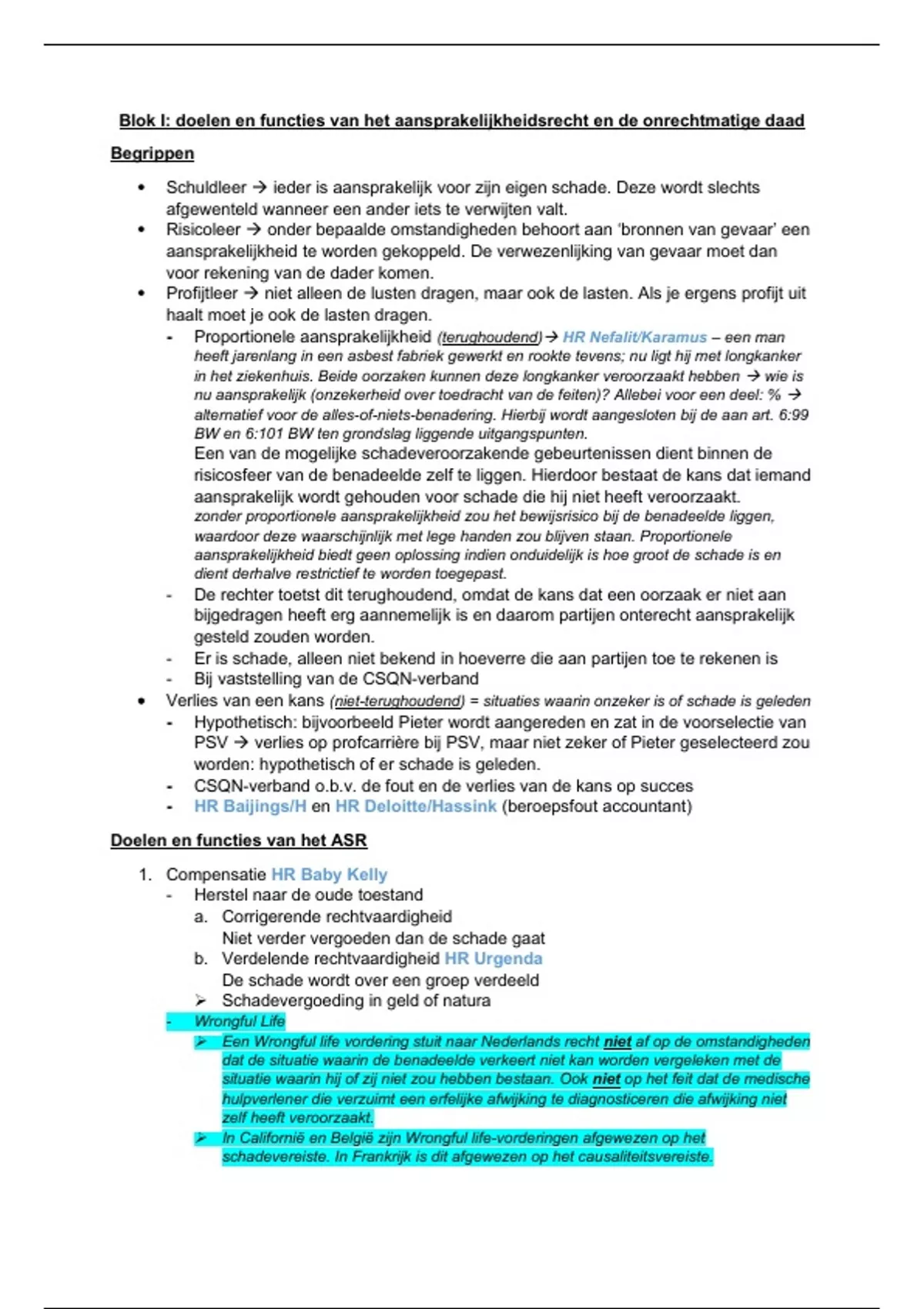 Dit document bevat alle jurisprudentie en tentamenstof voor het tentamen aansprakelijkheidsrecht van het 2e jaar (blok I t/m IV). Geschreven in 2023. Succes met leren voor het (her)tentamen!