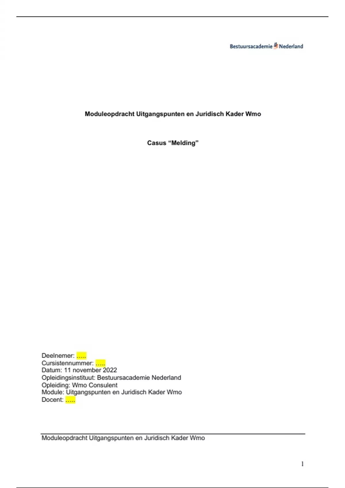 Tijdens de opleiding van Wmo consulent krijg je bij de opleider Bestuursacademie 3 module opdrachten, dat beoordeeld word door NCOI. Hierbij dien je een case uitwerking te schrijven op het gebied van: -beschikkingsbrief n.a.v. van een casus - adviesrapportage n.a.v. een huis en keuken tafelgesprek - 3 beleid verbeter voorstellen voor een gemeente