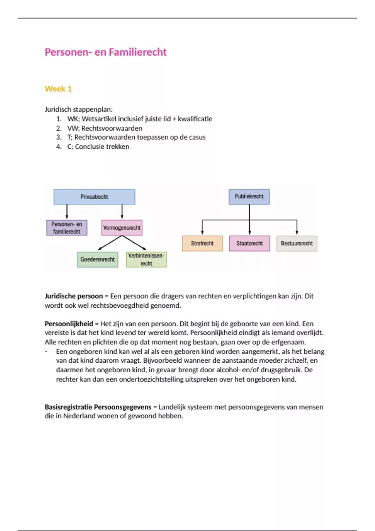 De samenvatting bevat de informatie voor het tentamen Personen- en familierecht . De samenvatting bevat daarnaast plaatjes en voorbeelden voor verduidelijking van de theorie. De samenvatting bevat de informatie voor het tentamen Verbintenissenrecht . De samenvatting bevat daarnaast plaatjes en voorbeelden voor verduidelijking van de theorie.