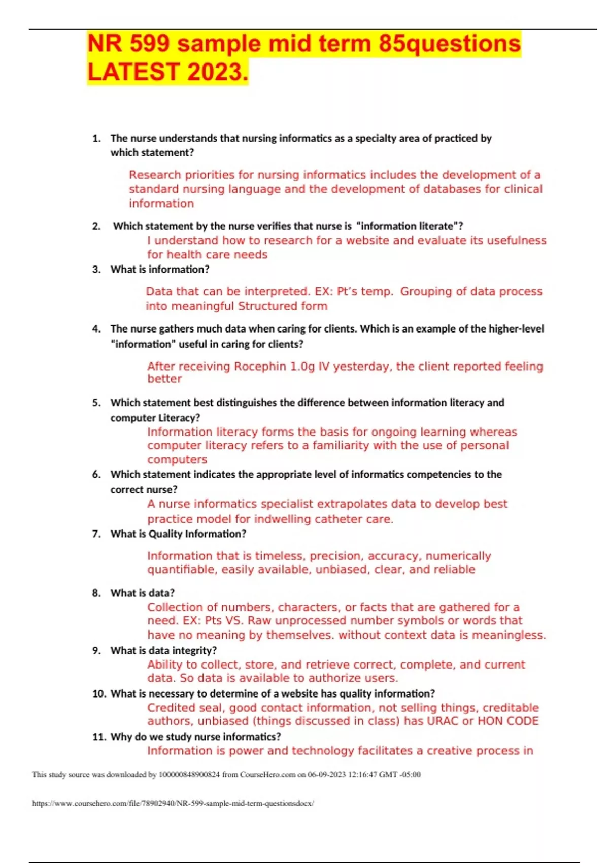 NR 599 sample mid term 85questions LATEST 2023. 2 Exam (elaborations) NR 599 MIDTERM REVIEW Chamberlain College of Nursing 3 Exam (elaborations) NR 599 final exam study guide . 4 Exam (elaborations) NR 599 midterm exam Flashcards _ Quizlet.