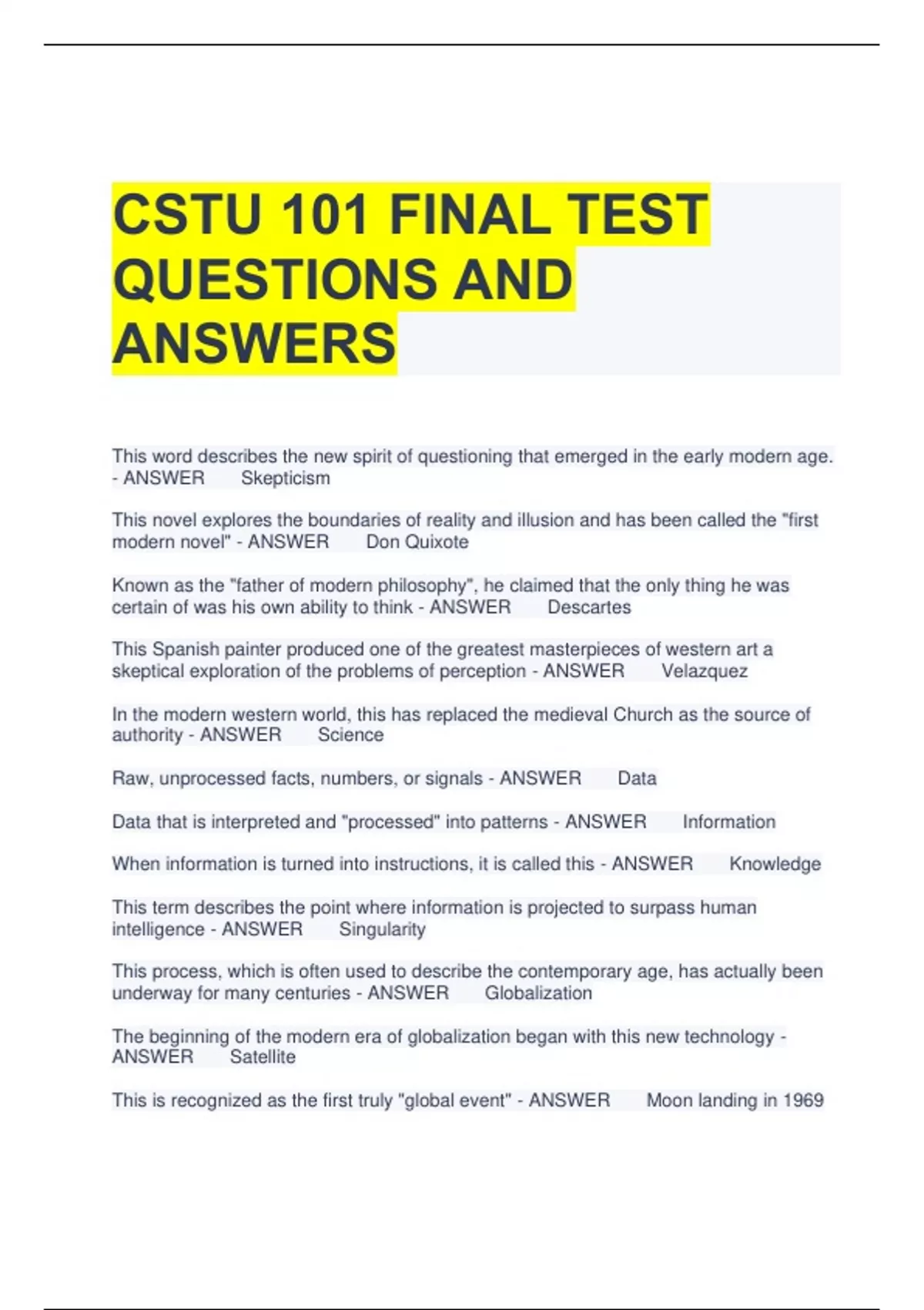 CSTU 101 Exam 3 Questions with Correct Answers 2 Exam (elaborations) CSTU 101 Test 1 Questions and Correct Answers 3 Exam (elaborations) CSTU 101-Exam 4 Questions and Answers 4 Exam (elaborations) CSTU 101 Final Exam Questions with All Correct Answers 5 Exam (elaborations) CSTU 101 Quiz 4 Questions with Correct Answers 6 Exam (elaborations) CS