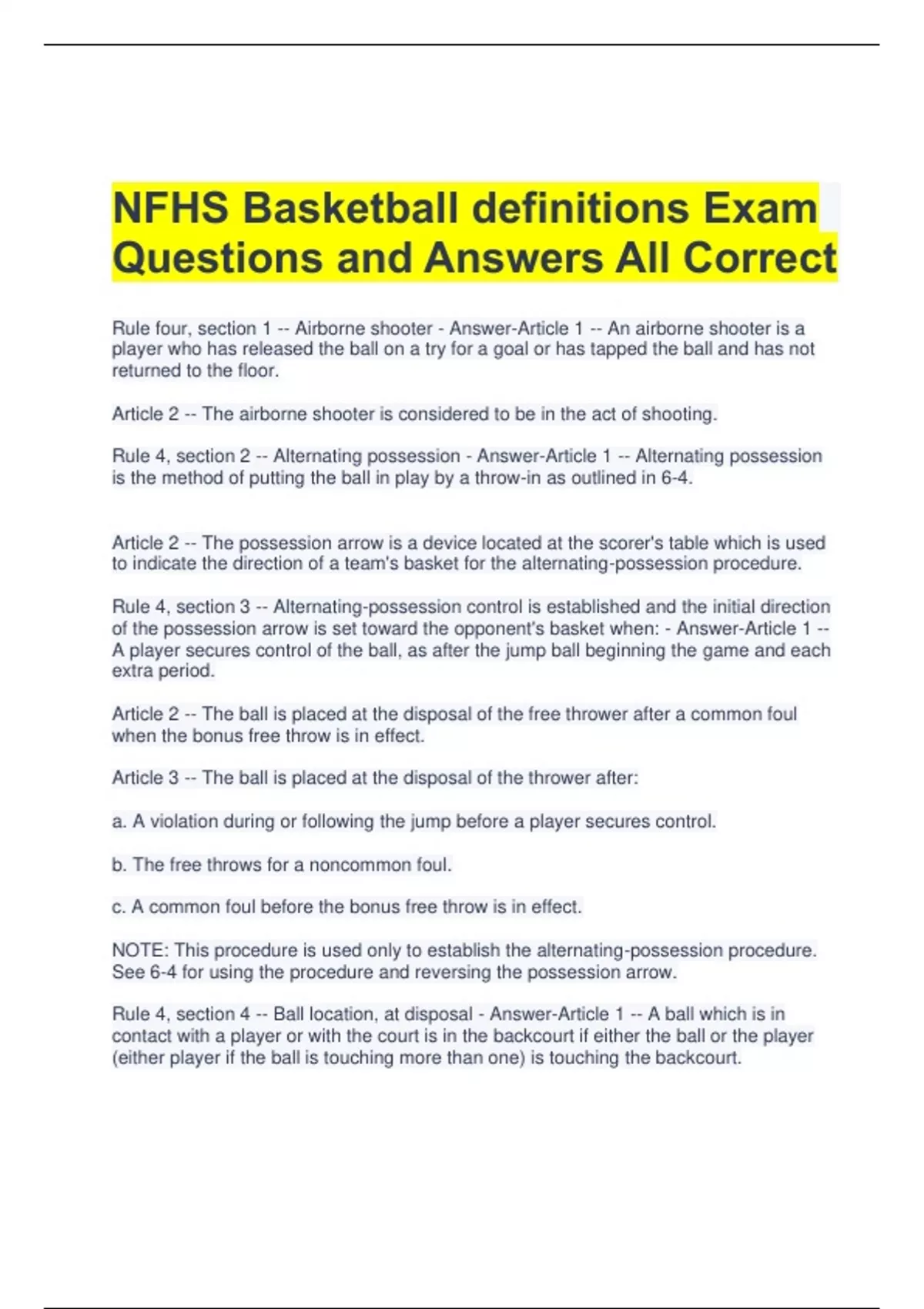 Basketball Exam Exam Questions with Correct Answers A Grade 2 Exam (elaborations) NFHS Basketball Casebook Part Exam Questions and All Correct Answers 3 Exam (elaborations) NFHS Basketball Rules Test Questions and Correct Answers 4 Exam (elaborations) NFHS Basketball Exam Part II Questions and Answers All Correct 5 Exam (e