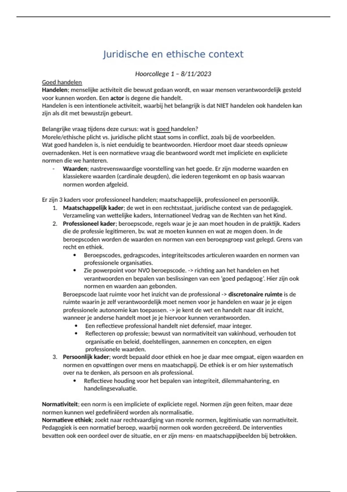 Aantekeningen van alle hoorcolleges Juridisch Ethische Context en samenvatting van het volledige boek Jeugdrecht Begrepen (7e herziende druk) met aanpassingen t/m 2023. Belangrijke begrippen zijn dikgedrukt, colleges zijn met belangrijke afbeeldingen. Er soms verwezen naar een powerpoint van het desbetreffende hoorcollege, dia staat ook vermeld.
