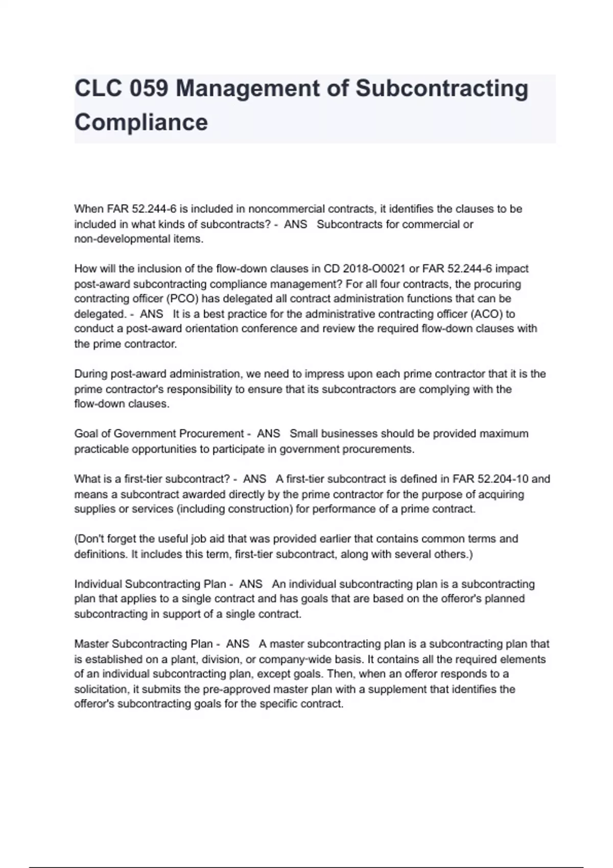 CLC 059 Management of Subcontracting Compliance Exam Questions And Answers