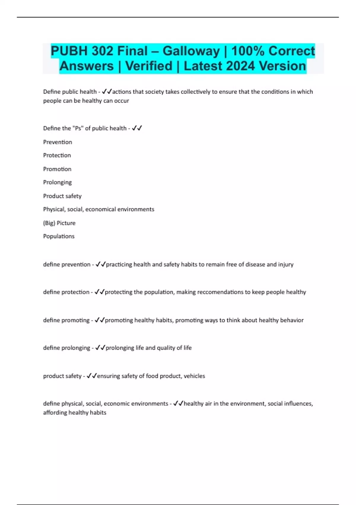 PUBH 302 Final – Galloway | 100% Correct Answers | Verified | Latest 2024 Version