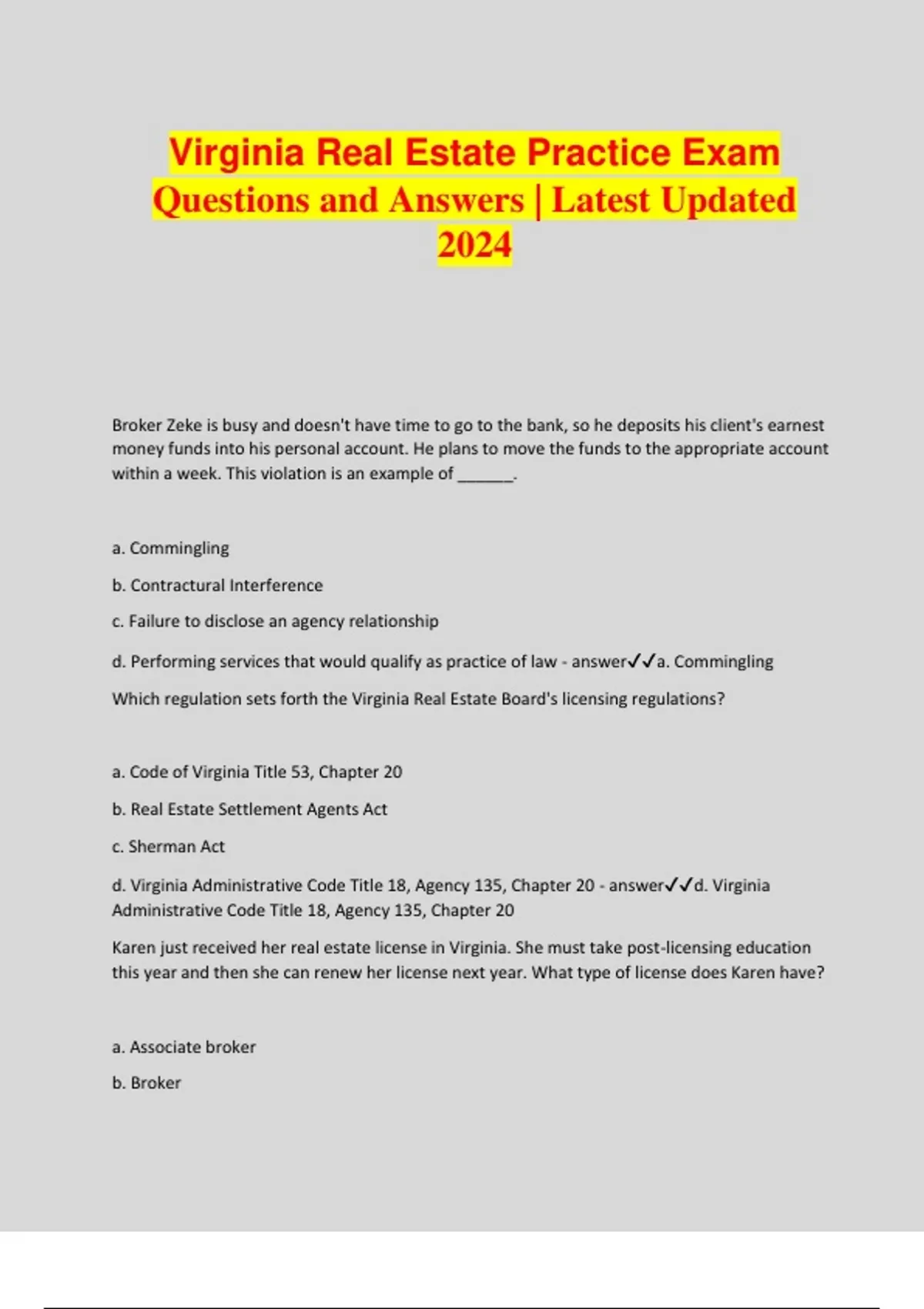 Virginia Real Estate Practice Exam Questions and Answers | Latest Updated 2024