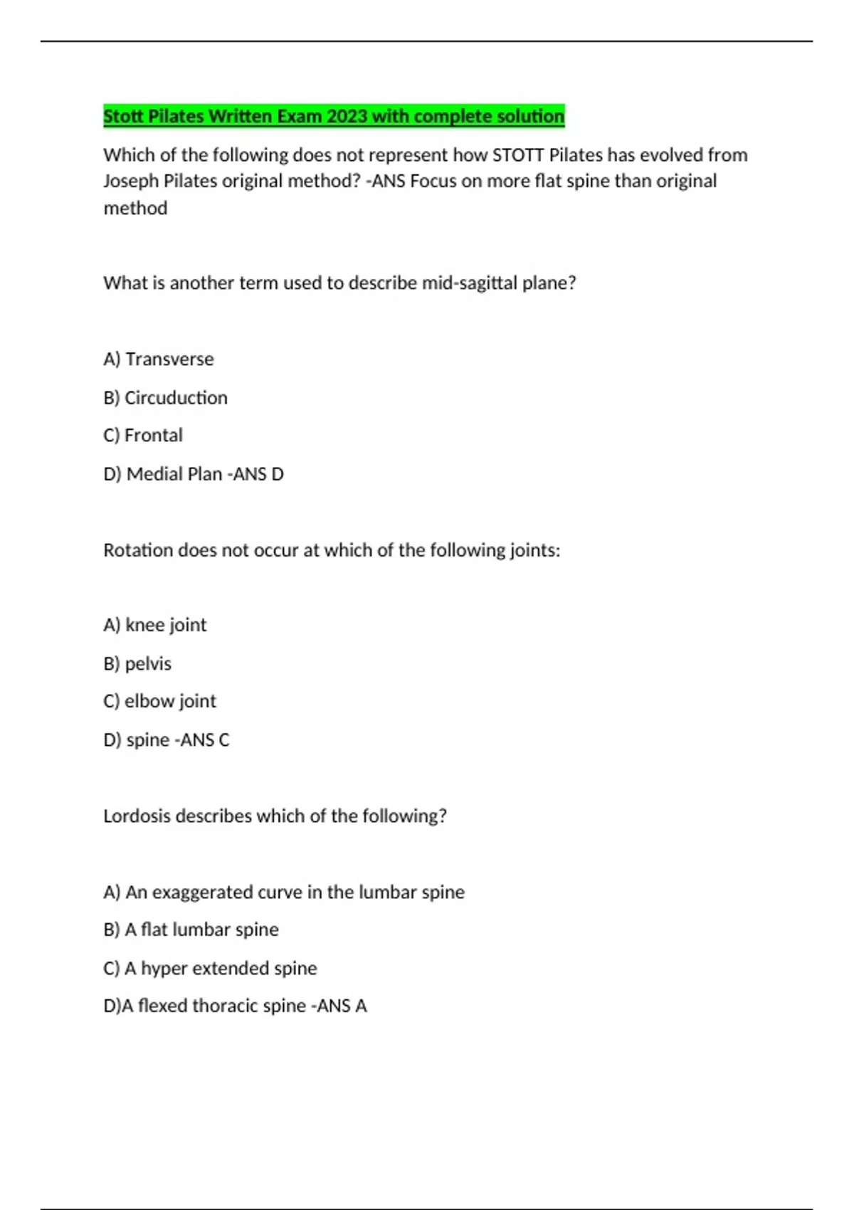 STOTT pilates- Postural alignment Exam with complete solution/Anatomy - Stott Pilates Exam Preparation- 60 QUESTIONS- WELL SOLOVED/Stott Pilates Written Exam question with 100% correct answers/Stott Pilates Written Exam 2023 with complete solution