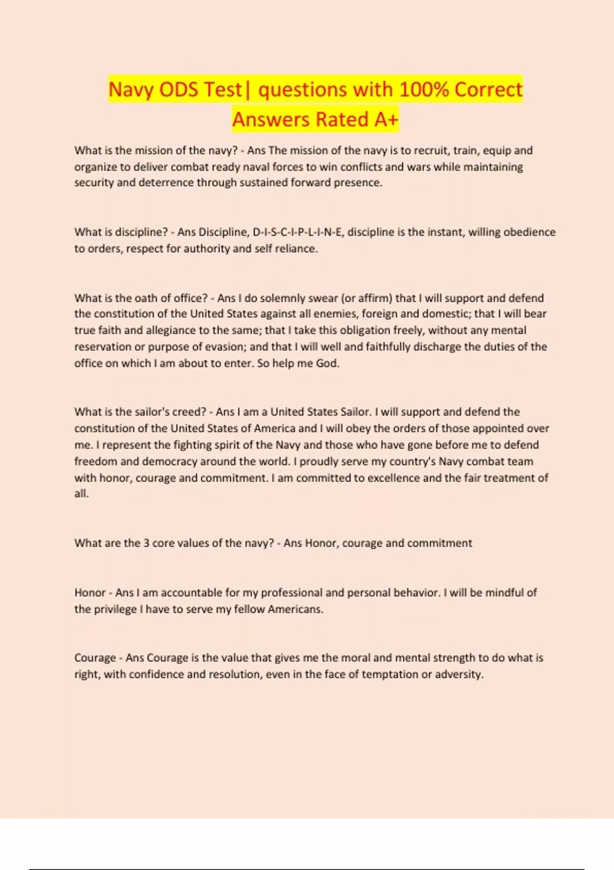 Navy ODS Test| questions with 100% Correct Answers Rated A
