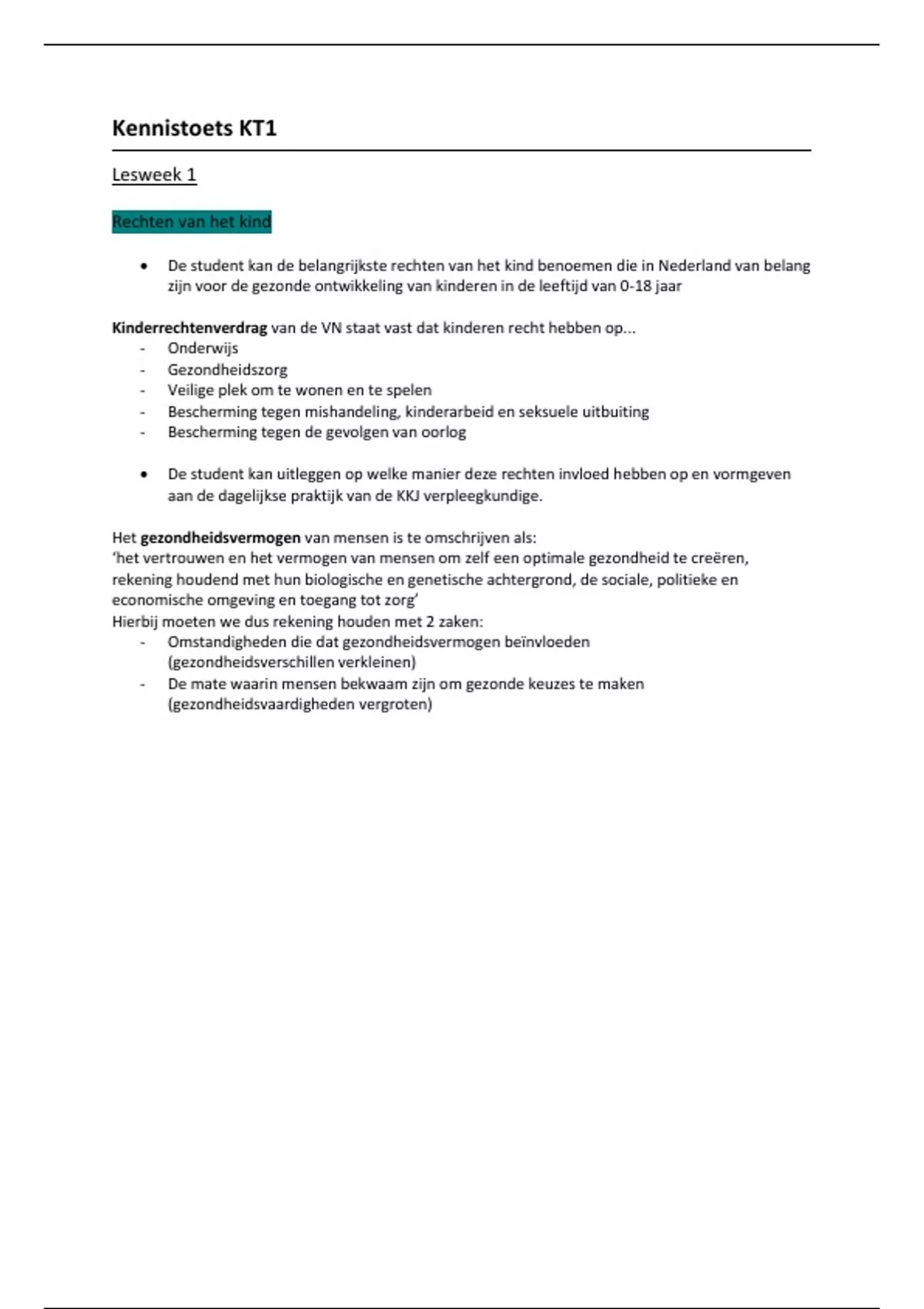 De samenvatting is voor studenten hb0-verpleegkunde in jaar drie of vier, die de minor Kraam Kind Jeugd (KKJ) volgen. De samenvatting bevat alle stof (waaronder colleges en informatie uit de boeken) van KT1 klinisch redeneren en KT2 pedagogische relatie.