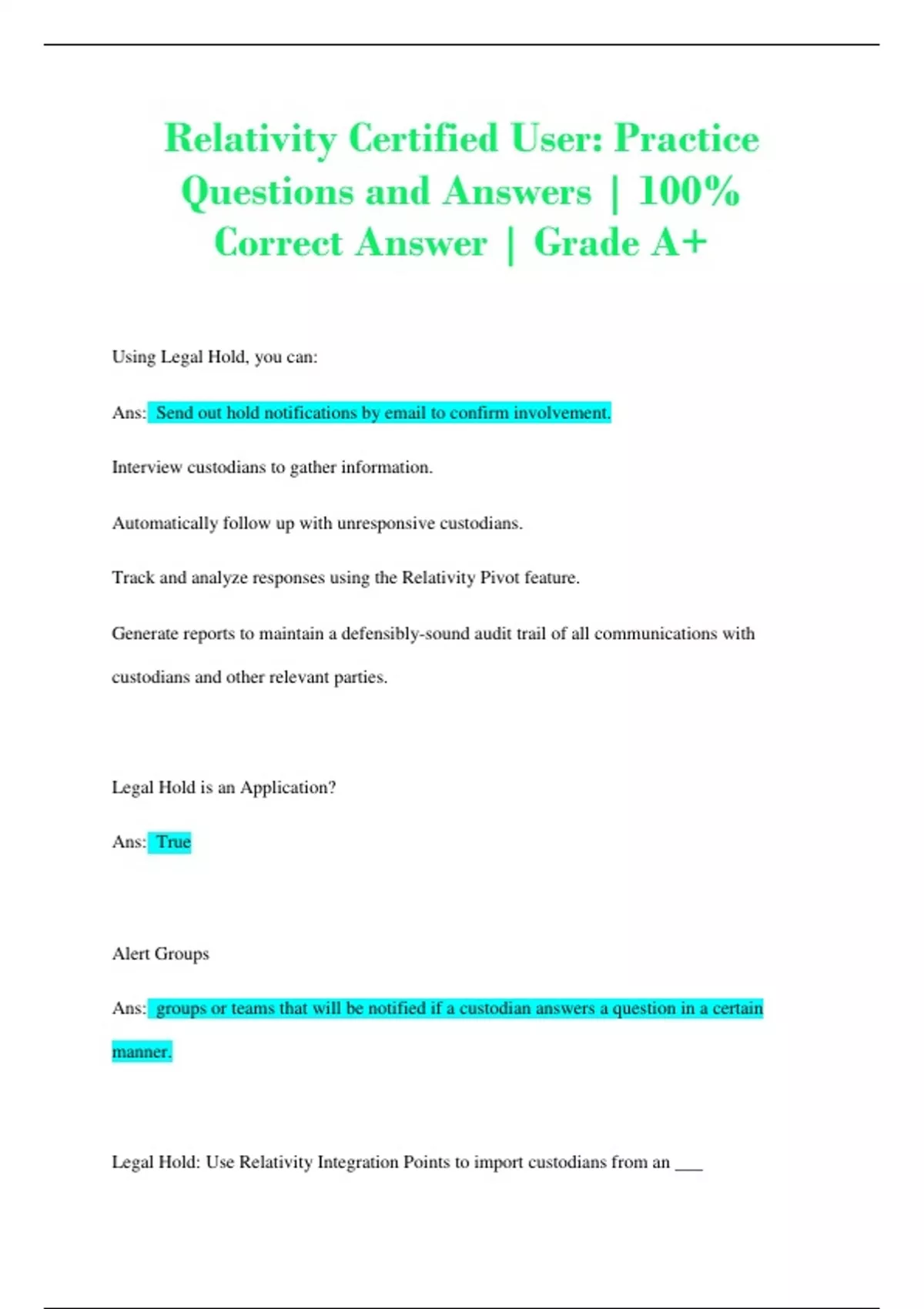 Relativity Certified User: Practice Questions and Answers | 100% Correct Answer | Grade A+
