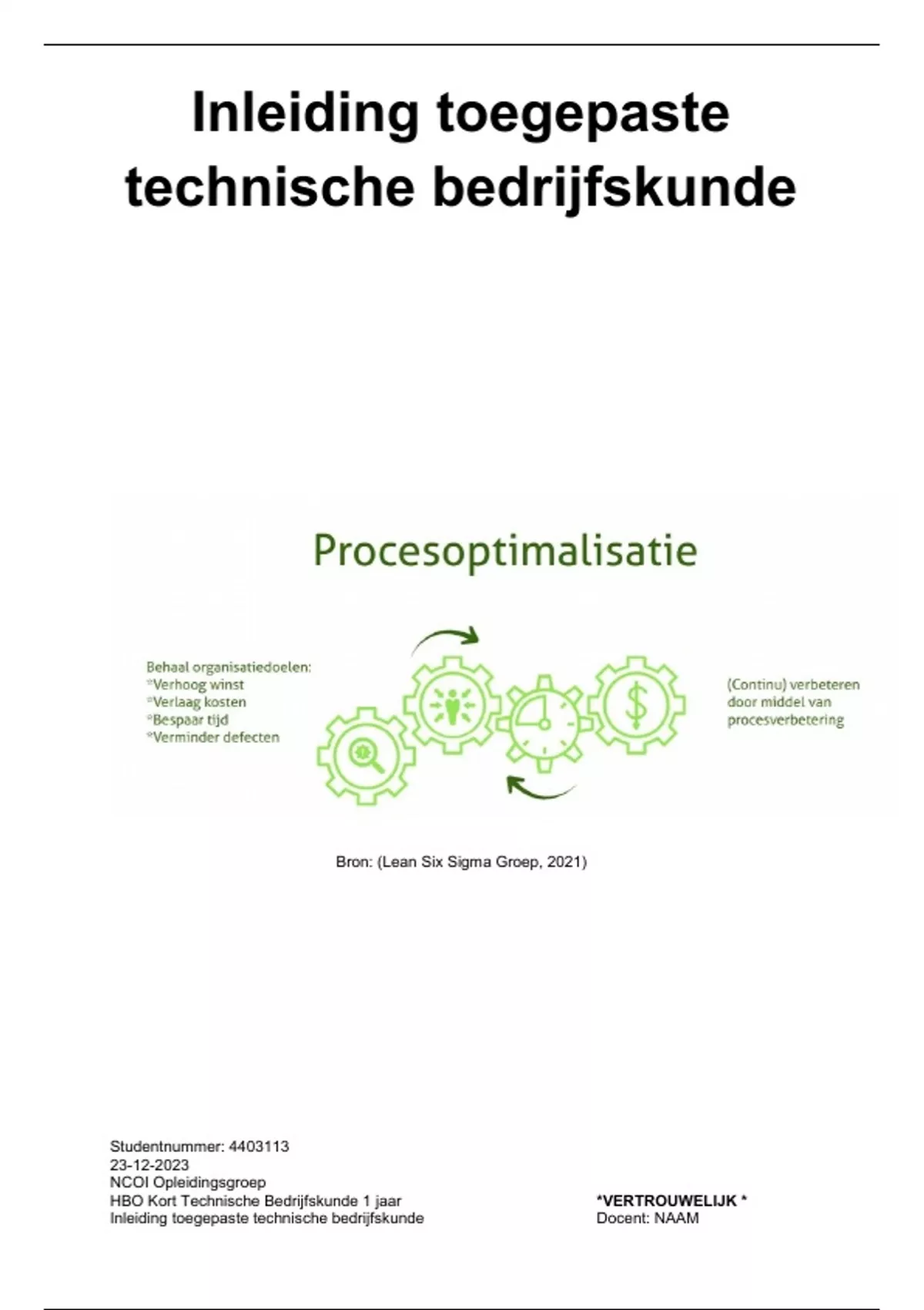 4 onderdelen Uitwerkingen van de moduleopdrachten: - Inleiding toegepaste technische bedrijfskunde - Professioneel en oplossingsgericht werken Uitwerking van de eindopdracht: - Integrale opdracht HBO Technische Bedrijfskunde Uitwerking van Kwaliteits- en servicemanagement: - Oefenexamenvragen inclusief antwoorden