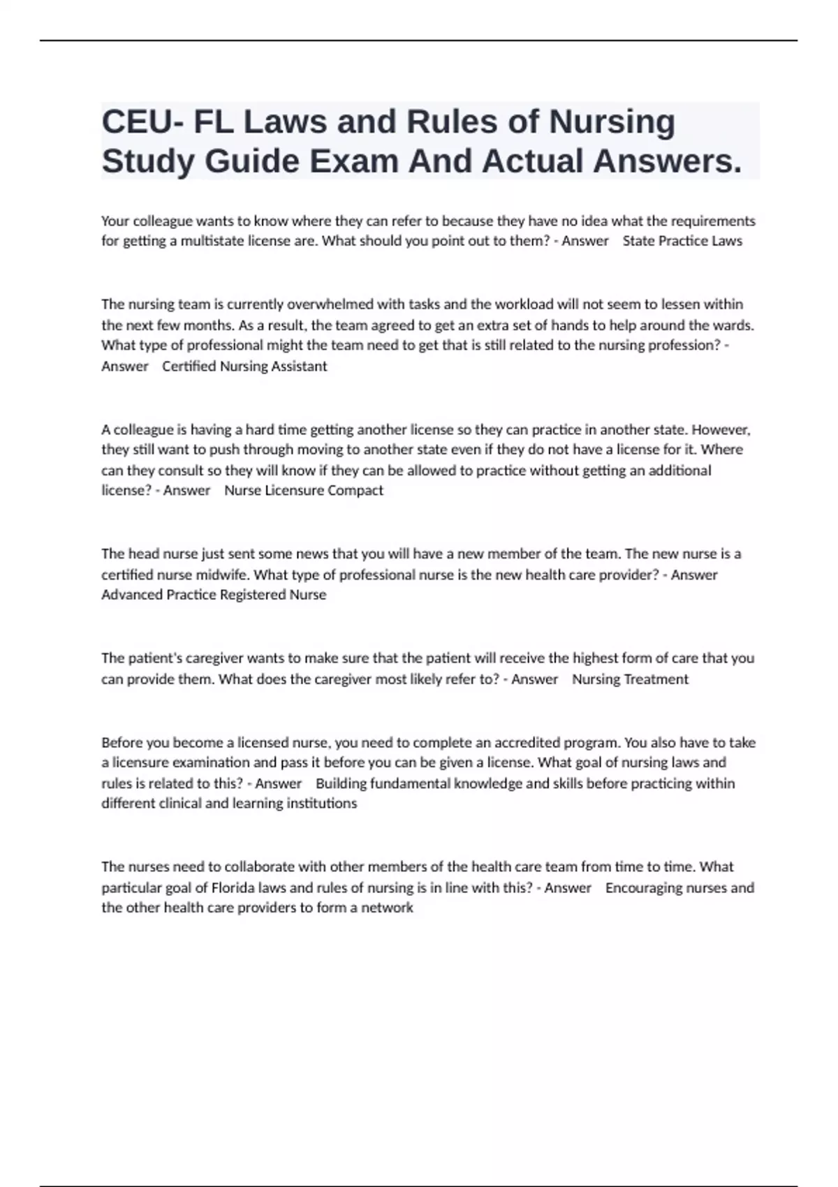 1 Exam (elaborations) Leadership, chapter 4: nursing licensure & certification Final Exam Answered Correctly. 2 Exam (elaborations) Role of the Nurse Educator Final Exam Questions And Actual Answers. 3 Exam (elaborations) Nursing Education Midterm Exam Questions And Complete Answers. 4 Exam (elaborations) Nursing Jurisprudence and Ethics for Tex
