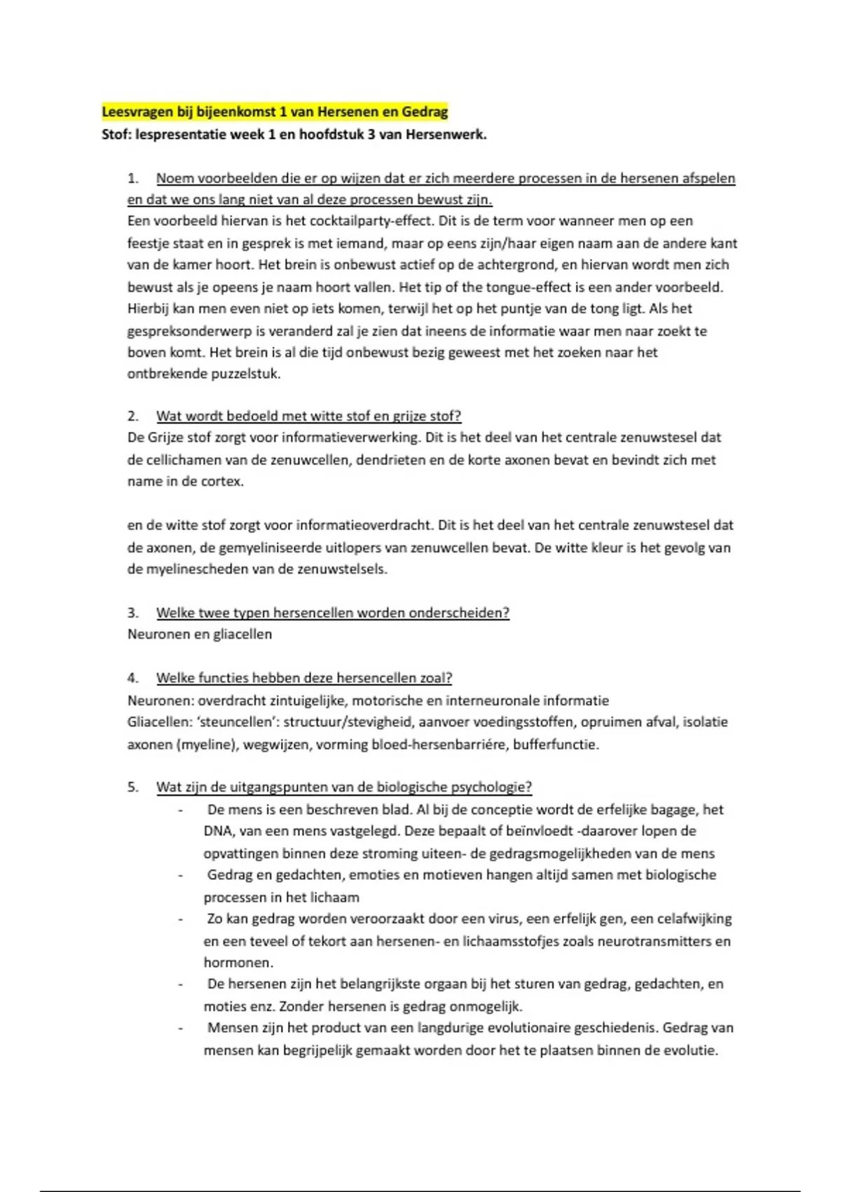 In dit document zijn alle leesvragen voor het vak Hersenen & Gedrag uitgebreid beantwoord en de anatomie van het brein. Dit is een erg goede basis voor de voorbereiding op het tentamen. Het vak Hersenen & Gedrag is onderdeel van de minor Toegepaste Psychologie aan de Hogeschool Utrecht.