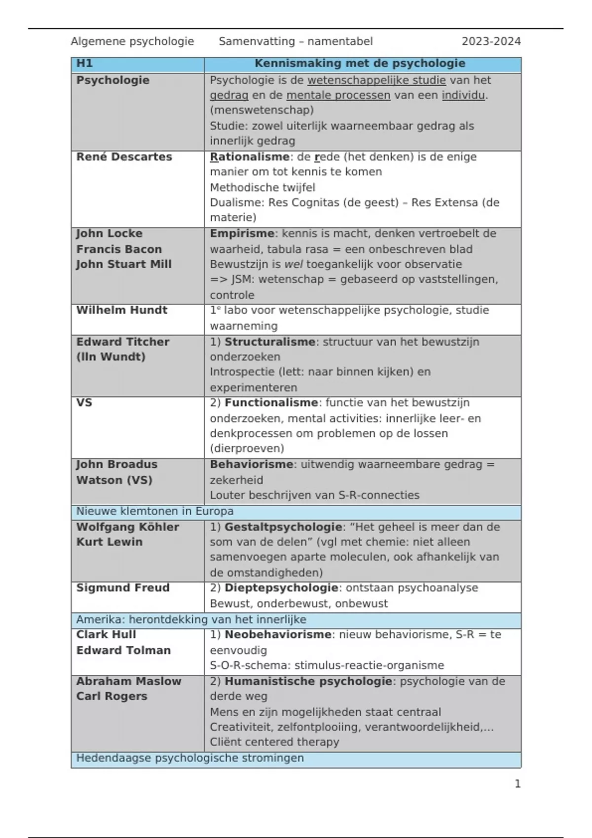 Dit bevat zowel mijn grote (volledige) samenvatting van Algemene Psychologie als mijn kortere samenvatting, die handiger is voor het overlopen van de informatie en zo kun je ook één van de twee kolommen afdekken en testen of je de informatie beheerst. Algemene Psychologie, VIVES Kortrijk, BaTP,
