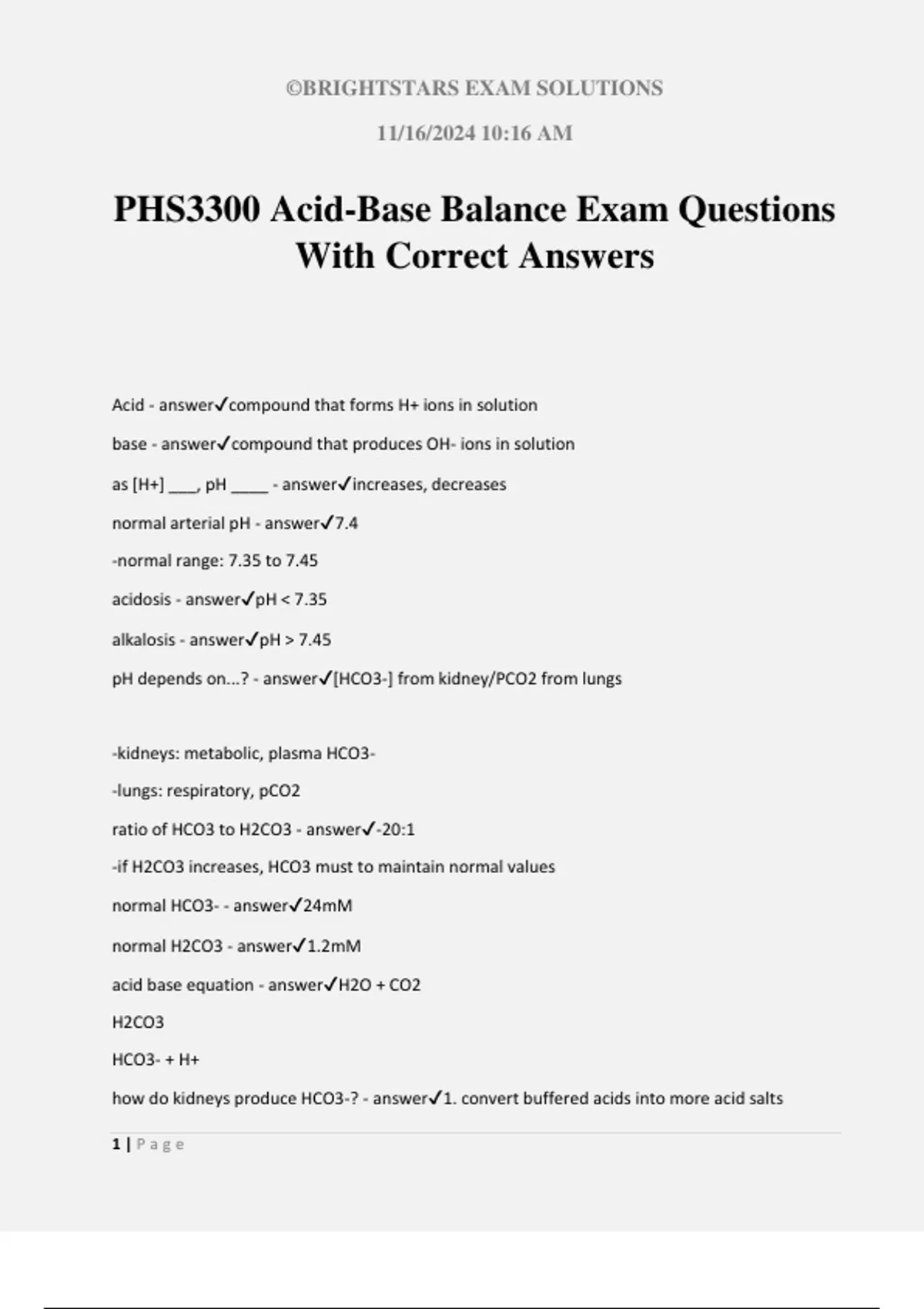 PHS3300 Acid-Base Balance Exam Questions With Correct Answers