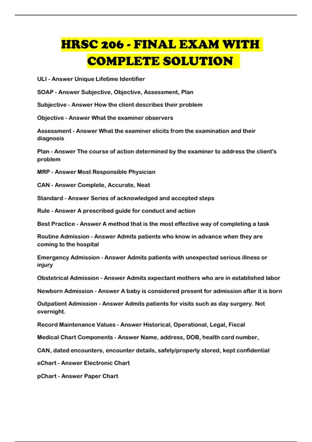 HRSC 206 - FINAL EXAM WITH COMPLETE SOLUTION