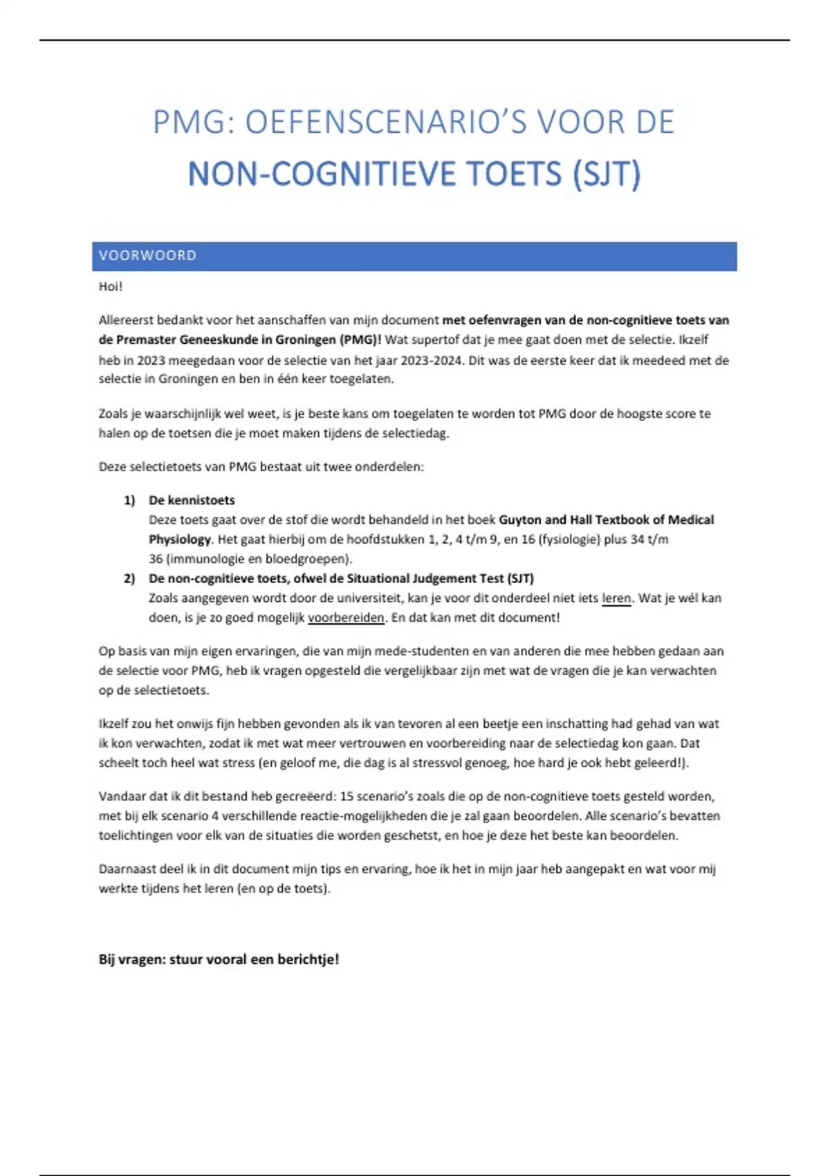 Wil jij je optimaal voorbereiden op de non-cognitieve toets (SJT) van PMG? Met deze voordeelbundel krijg je toegang tot beide oefendocumenten, goed voor 30 realistische scenario’s met uitgebreide toelichtingen, scores en strategieën. Vergroot je kans op succes en ga vol zelfvertrouwen de toets in!