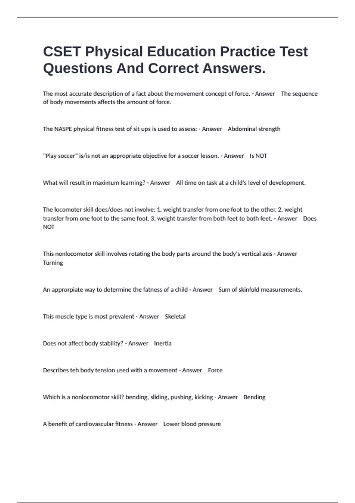 1 Exam (elaborations) CSET: Physical Education Subtest 3 Exam Questions And Correct Answers. 2 Exam (elaborations) CSET Physical Education Subtest III - Domain 1 Exam And Correct Answers. 3 Exam (elaborations) CSET Physical Education Subtest II Assessment and Evaluation Principles and Integration of Concepts Exam And Correct Answers. 4 Exam (ela