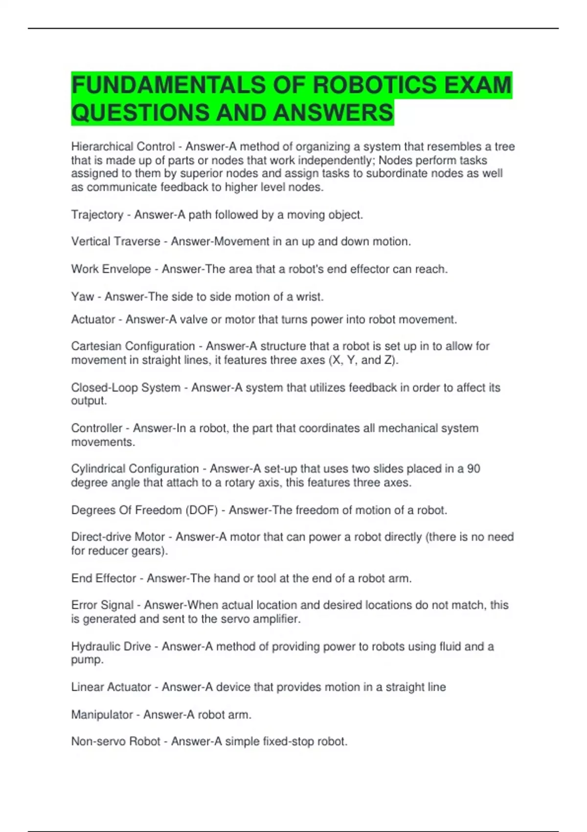 ROBOTICS EXAM QUESTIONS AND ANSWERS BUNDLE PACKAGE
