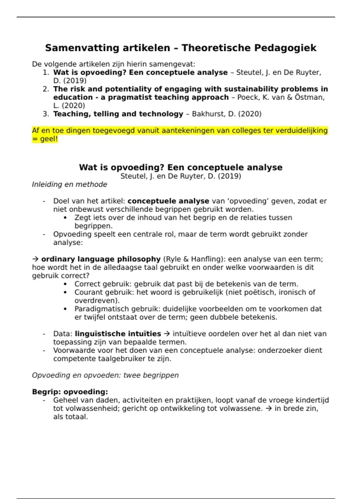 Samenvatting artikelen Sleutel & De Ruyter, Van Poeck & Östman, Bakhurst - Theoretische pedagogiek (PABAP021A)