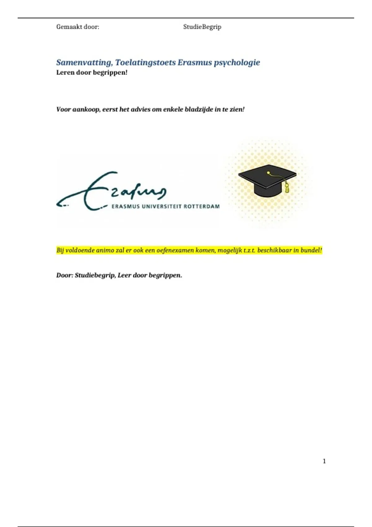 Erasmus Psychologie Bundel, Samenvatting + Oefenexamen